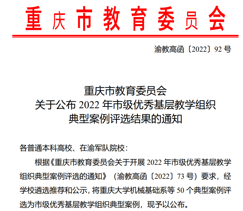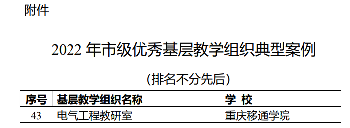 近日,重庆市教育委员会公布了2022年市级优秀基层教学组织典型案例评选结果,我校智能工程学院电气工程教研室获评市级优秀基层教学组织典型案例。