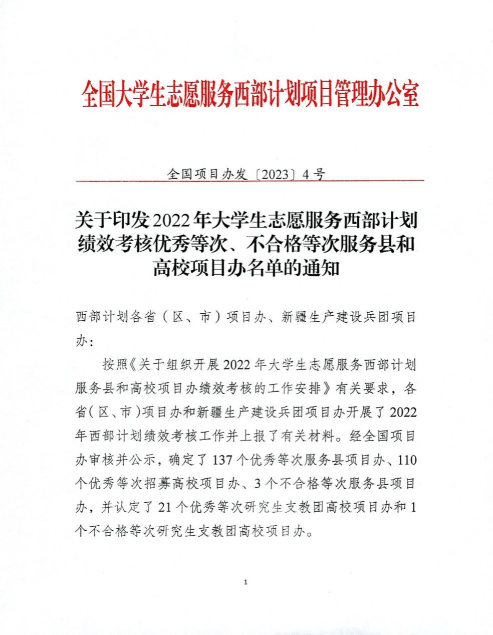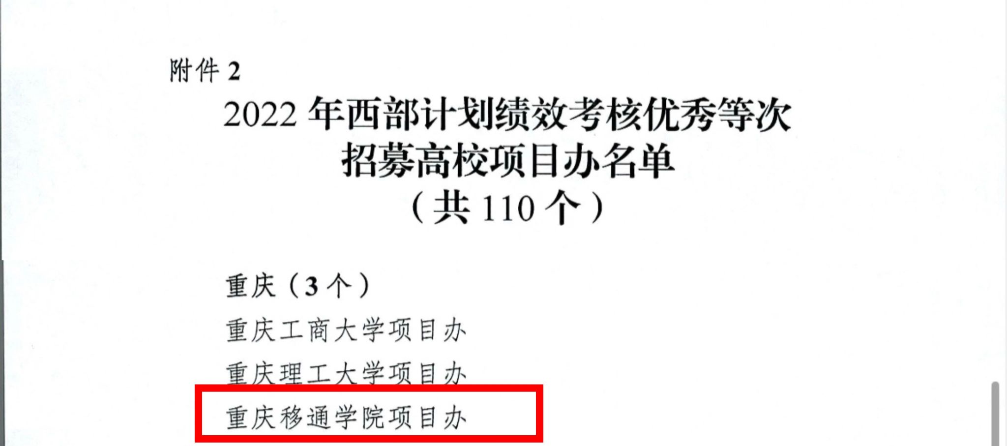 近日,全国大学生志愿服务西部计划项目管理办公室公布了2022年西部计划绩效考核结果,经市项目办考核上报,全国项目办评审和公示,我校获评2022年西部计划绩效考核优秀等次招募高校项目办。这是我校首次斩获该项荣誉,也是重庆市3所获评高校中唯一一所民办高校!