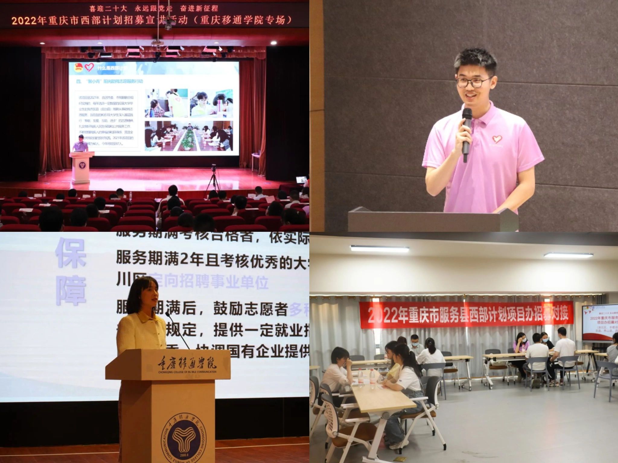 2022年,我校认真落实全国和市西部计划项目办相关工作部署,在学校党委的领导下,强化顶层设计,完善机制建设,突出示范引导,加强校地联动。校团委(西部计划项目办)扎实推进大学生志愿服务西部计划各项工作,主动加强与市西部计划项目办、服务地项目办的沟通联系,承办重庆市西部计划招募宣讲活动,引进多个区县项目办进校点招优秀毕业生,努力拓宽工作渠道,积极争取优质岗位。此外,通过典型选树宣传、往届优秀分享、校地联动等广泛宣传动员,共选拔82名优秀应届毕业生成为西部计划志愿者,并成功派遣至新疆、西藏等西部地区基层一线岗位奉献青春,志愿者招募数量和质量均连年提升,工作成效明显。