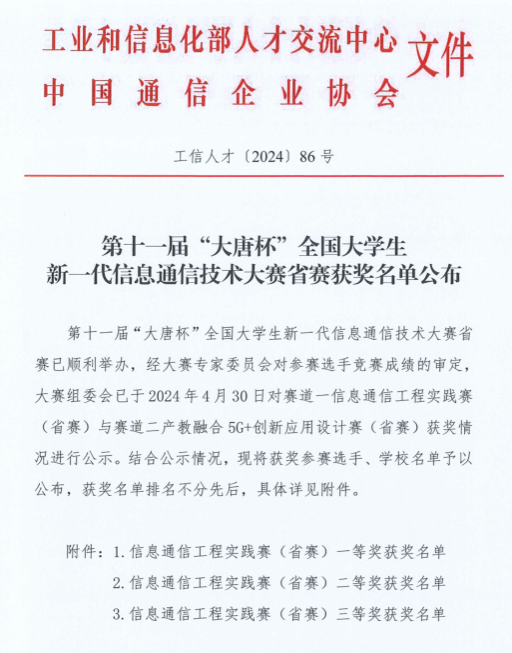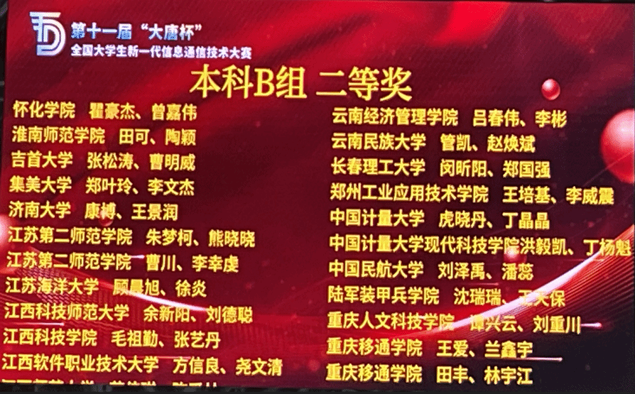 近日,由工业和信息化部人才交流中心、中国通信企业协会共同主办的第十一届“大唐杯”全国大学生新一代信息通信技术全国总决赛在北方工业大学落下帷幕。我校学子在本届大赛中获得重庆市本科B组一等奖3组、二等奖6组、三等奖16组,获得一等奖的3组学生成功晋级国赛;并在全国总决赛中获得全国本科B组一等奖1组、二等奖2组,全员获奖。本次获奖是参加历届大唐杯以来在国赛中取得的最佳成绩,本校也成为本届全国赛中重庆市获奖比例最高的高校。