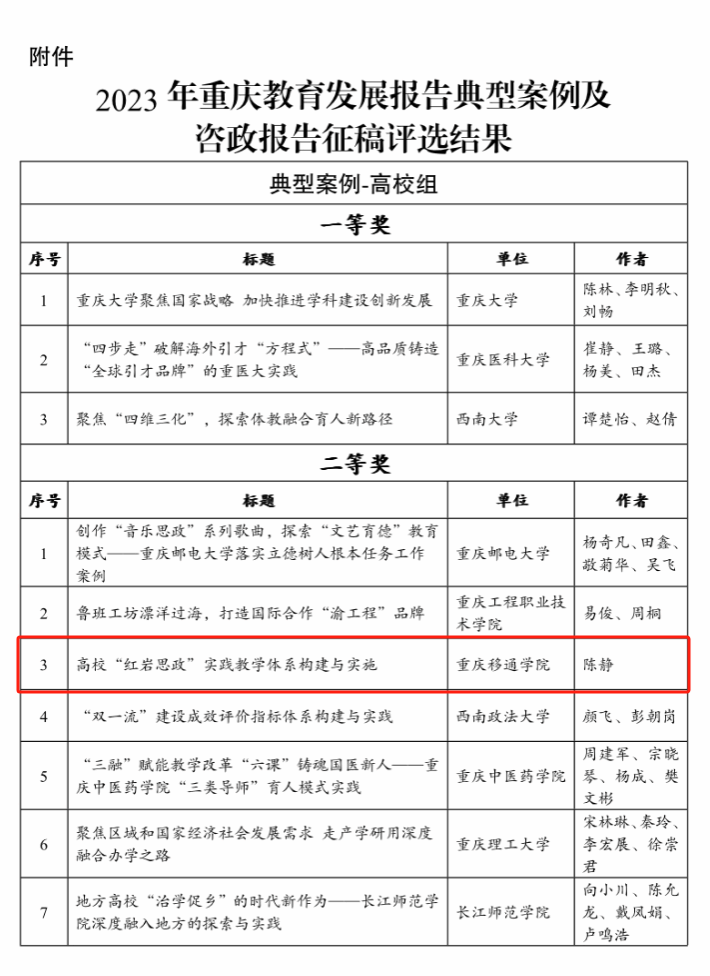 近日,重庆市教育委员会公布了2023年重庆教育发展报告典型案例及咨政报告征稿评选结果,我校马克思主义学院副教授陈静的《高校“红岩思政”实践教学体系构建与实施》荣获典型案例高校组二等奖。