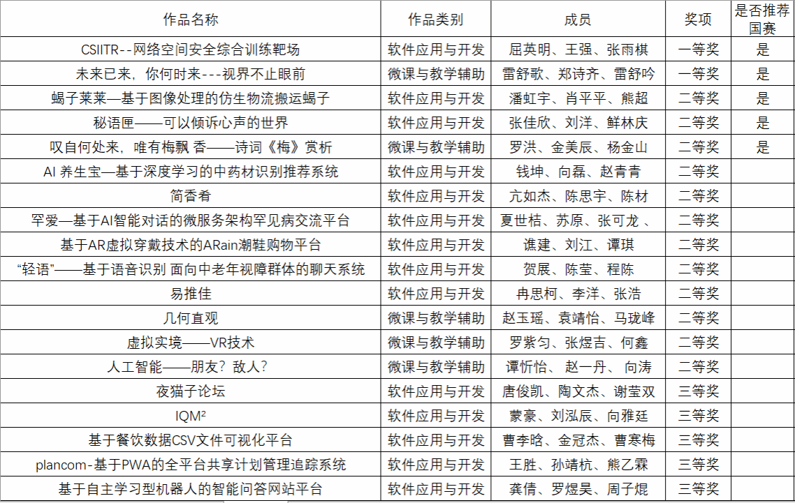 在取得优异成绩的同时,双体教师们也及时总结反思,赛事中仍然存在很多需要改进的地方。一是参赛类别不够全面,主要集中在软件应用与开发、微课与教学辅助、信息可视化设计等以往参赛较多的类别上,其它类别涉及较少;二是作品功能全面性和创新性还是有待进一步增强,需要提前至少半年谋划和准备;三是文档编写和答辩准备还要在前置一些时间,特别是争取进入国赛的队伍要重点保障。不断汲取经验,相信在后续赛事参赛过程中,面对更强的竞争更少获奖比例时,双体参赛队伍也能从容应对。