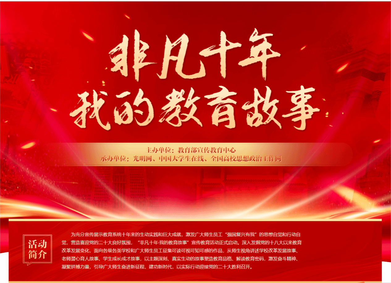 “非凡十年·我的教育故事”宣传教育活动是教育部宣传教育中心为充分宣传展示教育系统十年来的生动实践和巨大成就,激发广大师生员工“强国复兴有我”的思想自觉和行动自觉,营造喜迎党的二十大良好氛围举办的重要活动。