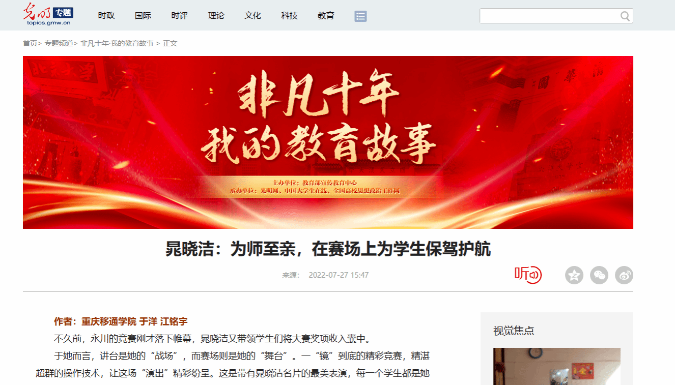 近日,由我校宣传新闻中心撰写的优秀教师稿件《晁晓洁:为师至亲,在赛场上为学生保驾护航》,被遴选为教育部宣传教育中心主办的“非凡十年 我的教育故事”宣传展示活动优秀作品,在光明网“非凡十年·我的教育故事”专题展示。