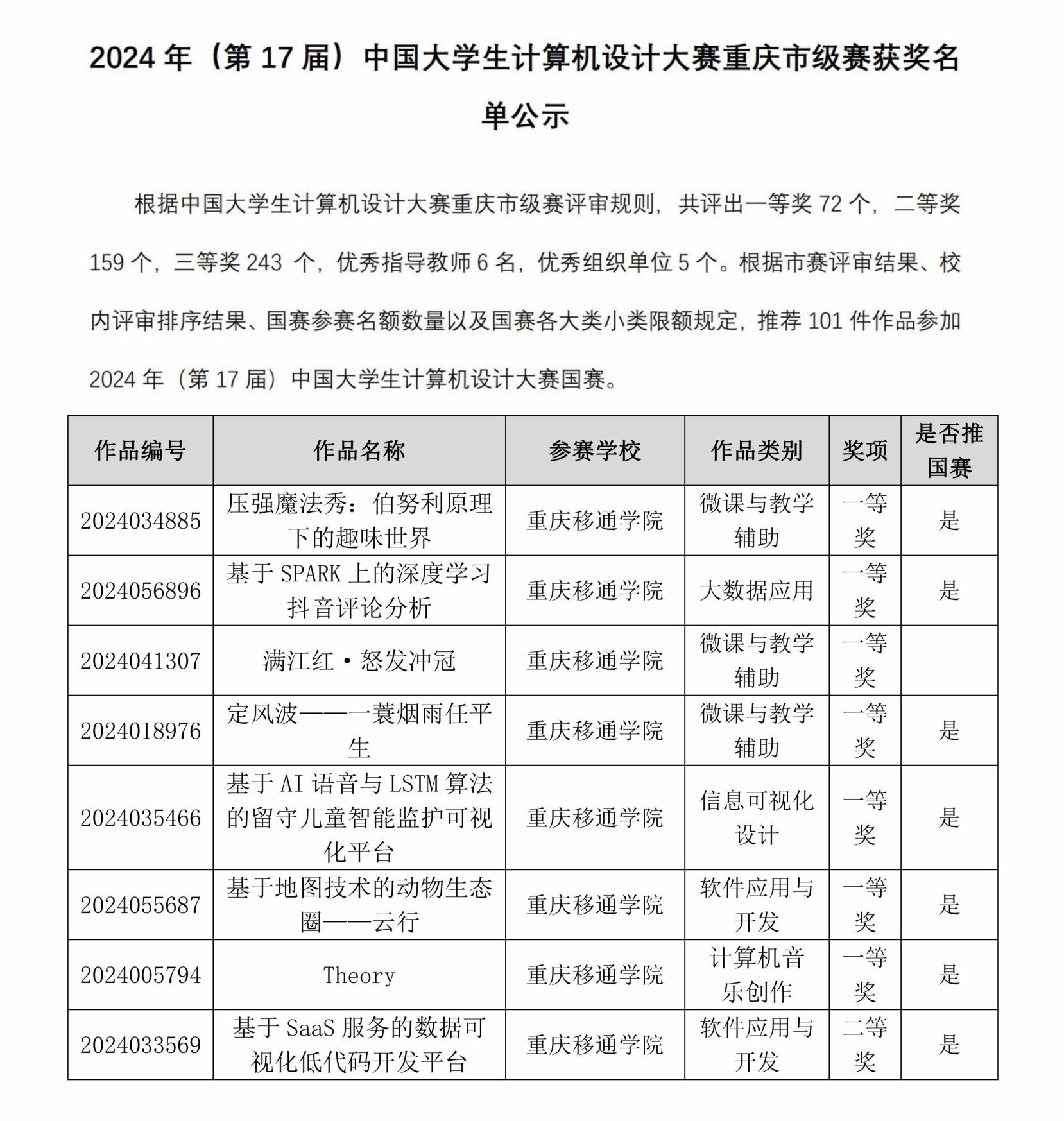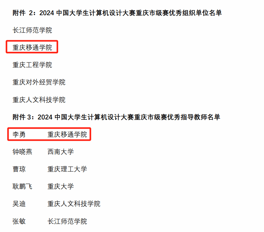 5月12日,第十七届中国大学生计算机设计大赛重庆市级赛在长江师范学院举办。我校精心组织,积极参赛,共有70支队伍荣获奖项,获奖数量位居全市第一。其中,8支队伍荣获一等奖,与西南大学并列重庆市第三名。学校荣获重庆市级优秀组织单位称号,教师李勇被授予市级优秀指导教师荣誉。