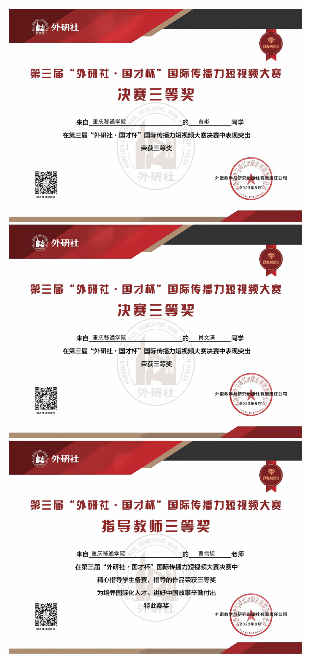 第三届“外研社·国才杯”国际传播力短视频大赛于3月23日开启。主题为“中国人物”,引导选手探寻慷慨前行、彰显中国精神的人物事迹。我校于6月成功举办校内选拔赛,共遴选11件优秀作品参与由重庆市教育委员会、重庆市普通本科高等学校外国语言文学类专业教学指导委员会及外语教学与研究出版社共同组织的2023“外研社·国才杯”国际传播力短视频大赛(重庆赛区)比赛。我校共有3组选手获得重庆赛区德语赛道亚军及季军称号,8组选手获得一等奖。