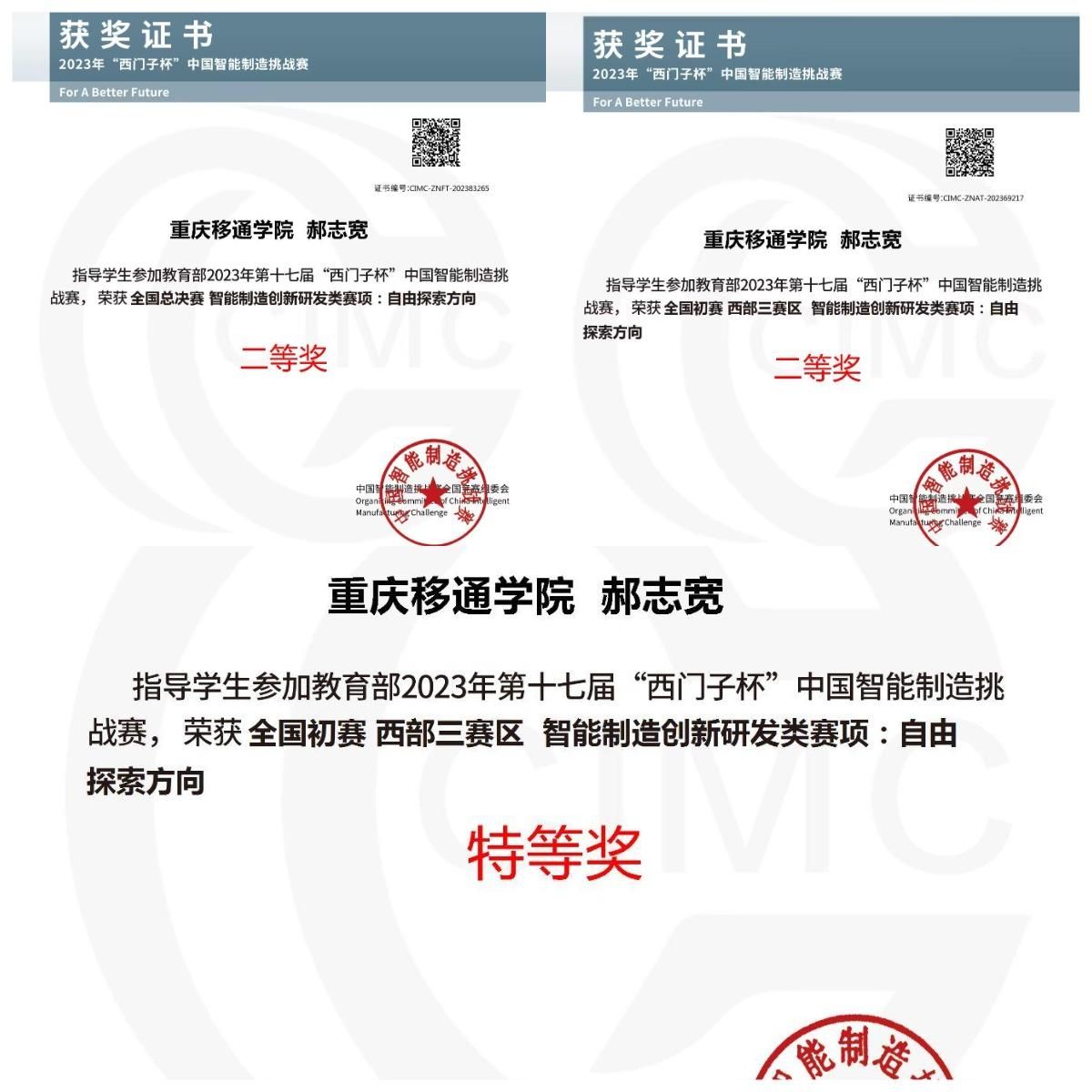 第十七届“西门子杯”中国智能制造挑战赛比赛规模、影响力均创历史新高,吸引了来自全国31个省、自治区、直辖市近700所高校、7180支队伍、超25000名师生参赛。我院学子在全国初赛中荣获特等奖2项,一等奖3项,二等奖5项,三等奖7项。由曹清静、樊佳鼎、王双龙三位同学组成的“森林奇缘队”成功晋级全国总决赛,于8月11日-15日在兰州理工大学与全国243所高校的523支队伍激烈角逐,最终荣获自由探索赛项全国二等奖。我校也是重庆市本科高校在该赛项中唯一获得全国奖的高校。同时,我校荣获2023年CIMC“西门子杯”中国智能制造挑战赛优秀组织奖,重庆市本科高校仅有四所学校获奖。