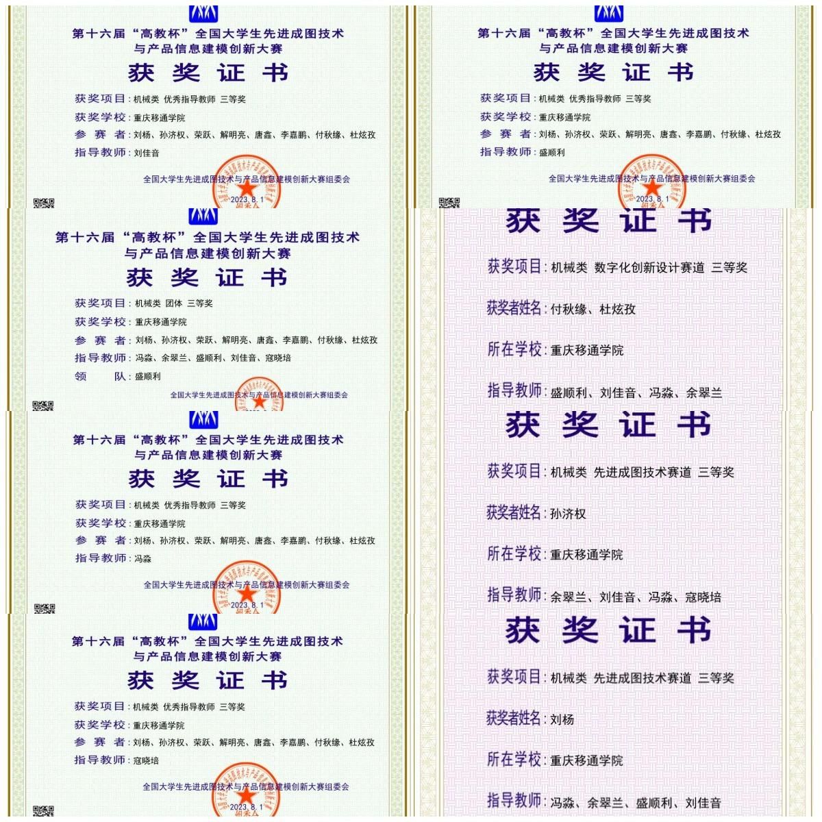 本届大赛从各校初赛到省市复赛再到全国总决赛,覆盖国内2千余所高校,参赛学生超过40万,其中来自全国740所高校、1188支代表队、共11330名选手参加了本届总决赛,参赛人数创历史新高。总决赛于7月28日-7月31日在重庆交通大学、重庆建筑工程职业学院举办。我院学子经过激烈角逐,最终不负众望,荣获国家级机械类团体三等奖1项,数字化创新设计三等奖1项,先进成图技术赛道个人三等奖2项,优秀指导教师三等奖5项;省部级机械类团体三等奖1项,数字化创新设计二等奖1项,轻量化设计三等奖1项,先进成图技术赛道个人二等奖2项、三等奖3项。此次比赛充分展现了我院学子在尺规绘图、计算机建模、3D打印、轻量化设计、数字化创新设计等方面的实践创新能力。