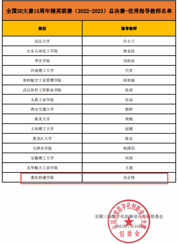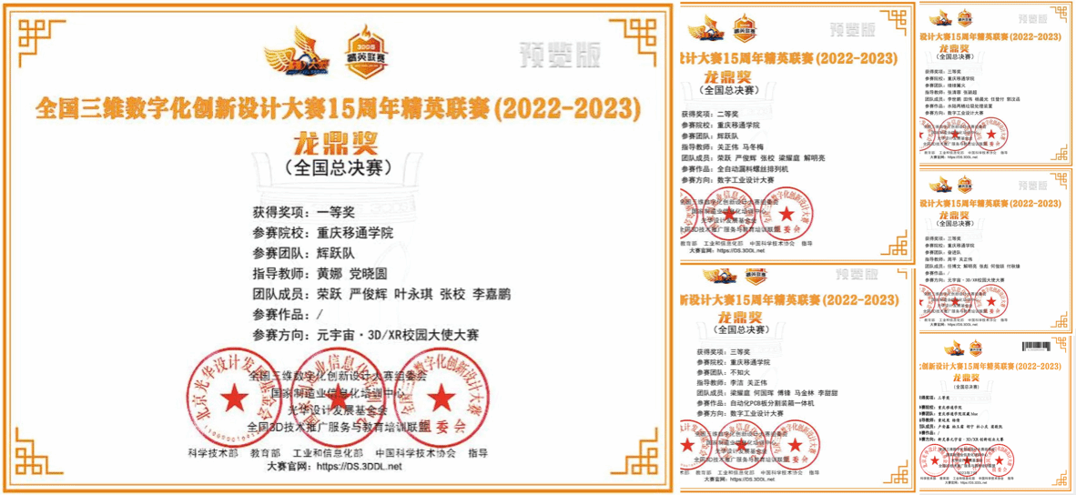 全国3D大赛15周年精英联赛(2022-2023)自2022年9月22日启动以来,全国有近600所高校,近900个院系报名参赛。各赛区、各院校参赛报名团队近10000个,提交初赛作品近12000件。我院学子在重庆赛区比赛中荣获特等奖5项、一等奖1项、二等奖3项,三等奖3项。其中6支队伍进晋级全国总决赛,与近500个团队角逐龙鼎大奖。在决赛中,参赛队员精心选题,深入研究三维数字化创新设计技术的最新发展趋势,将创新思想融入到作品中,反复推敲和改进,提交的作品得到评委专家的好评,最终我校荣获总决赛全国一等奖1项,二等奖1项,三等奖4项,取得了重庆移通学院自参赛以来3个重大突破,一是首次获得全国总决赛国家一等奖,二是参赛赛道由原来的1项扩展为3项,三是学校教师首次获评优秀指导教师。