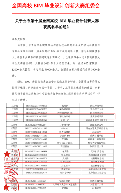 近日,第十届全国高校BIM毕业设计创新大赛圆满落幕。经过校内选拔、全国总决赛层层角逐,由数字经济与信息管理学院周梦娇、李红艳、杨礼静、张红、尹利茹、刘艳利等老师指导的工程管理专业学生参赛团队荣获本科组全国三等奖2项,优秀奖2项。