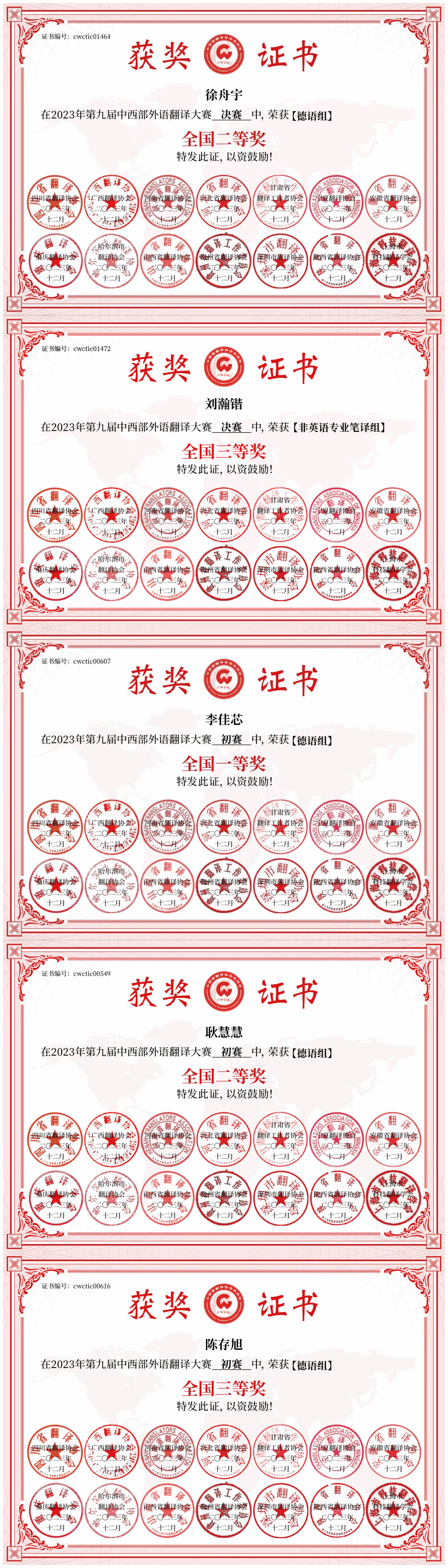 决赛中获得全国二等奖徐舟宇同学也分享了参赛心得:“这次比赛不仅是一次考验,更是一次锻炼和成长的机会。通过参加比赛,我不仅提高了自己的德语水平和翻译能力,还培养了自己的团队合作精神和应变能力。我相信,这些经历将对我的未来学习和工作产生积极的影响,我会继续努力,不断提高自己,为实现自己的梦想而努力奋斗。”