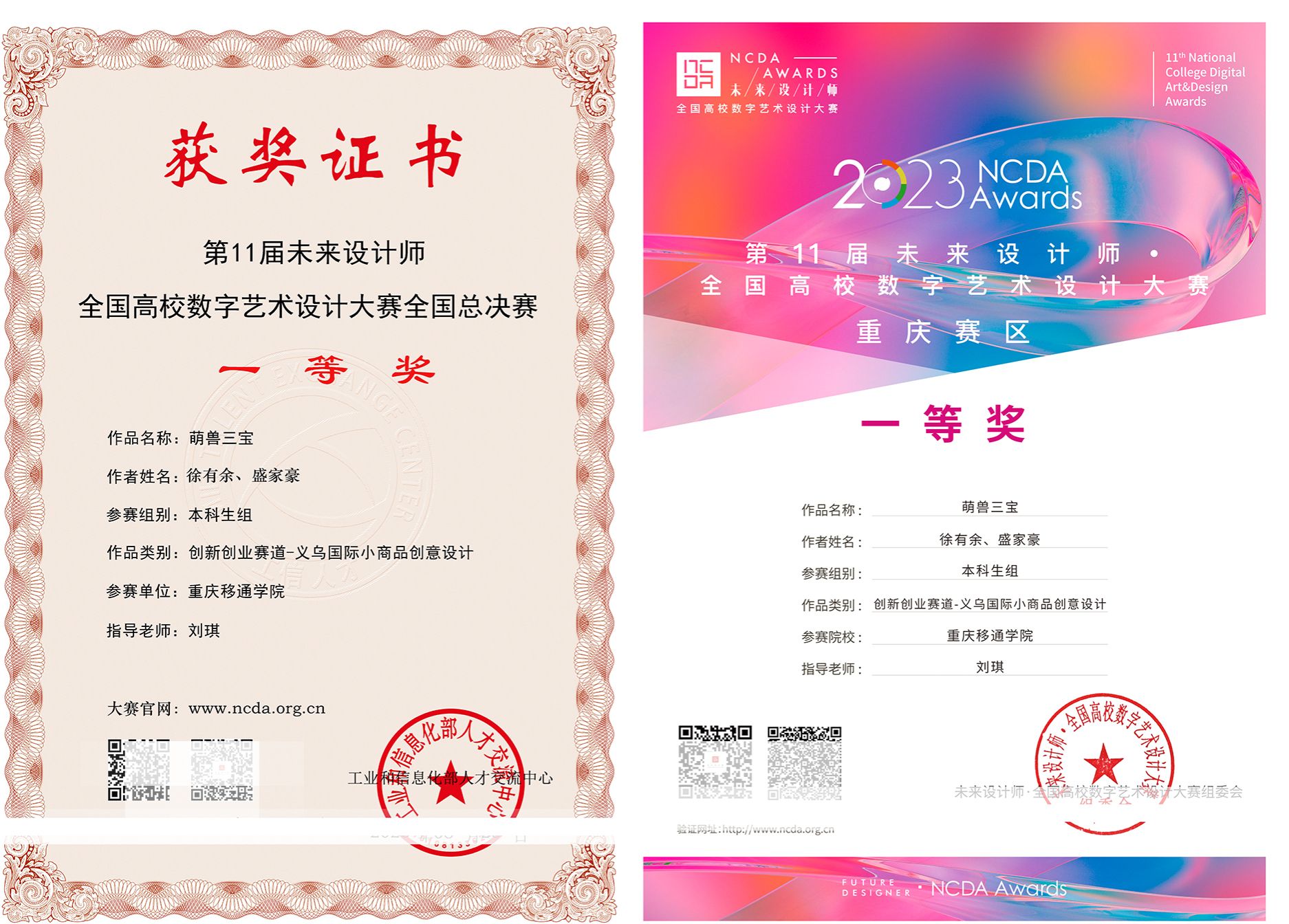 此次参赛的作品“萌兽三宝”,在众多优秀作品中崭露头角,顺利通过初赛、省赛、宣讲,以优异的成绩入围2023第六届“商城杯”全国 30 强,代表西部赛区在义乌参加全国总决赛路演,并获得全国一等奖,2023 第六届“ 商城杯”全国 30 强总决赛路演排名第8的好成绩并荣获3000元奖金。