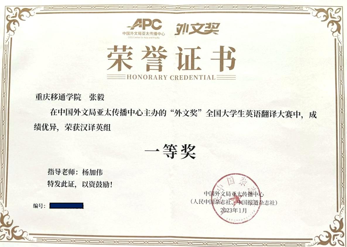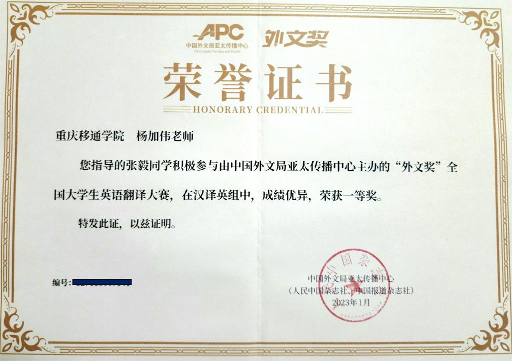 2022年9-11月,中国外文局亚太传播中心面向全国大学生举办了“外文奖”全国大学生英语大赛,共设翻译、词汇、阅读和写作四个赛道。翻译大赛吸引了包括北京外国语大学、上海外国语大学、复旦大学、南开大学、同济大学等在内的两千多所高校共计6887名学生参赛。我校学生首次参加该项赛事,与来自全国的数千名本科生、研究生学子同台竞技。经过初评(盲审)、复评(排名)及终评三个阶段的评审,外国语学院2020级英语专业学生张毅同学斩获汉译英组全国一等奖,杨加伟老师获指导教师奖。此项赛事汉译英组全国一等奖获奖人数共218名,约占本组参赛人数的3%。