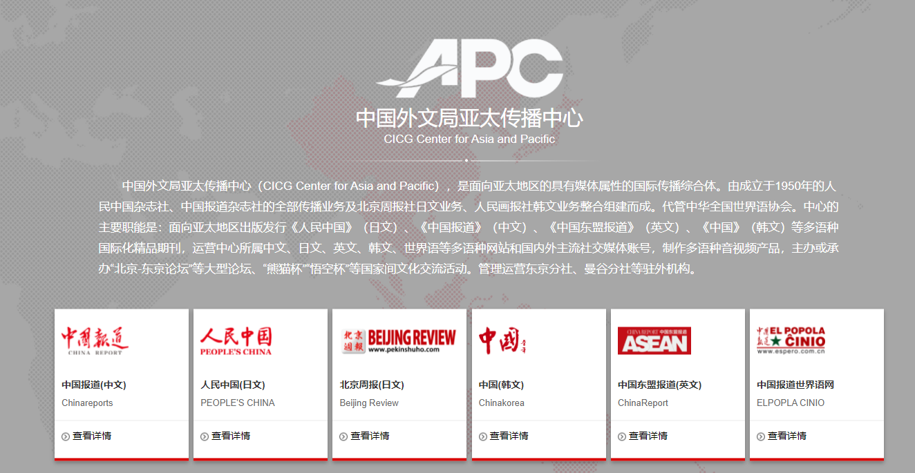 中国外文局亚太传播中心(CICG Asia-Pacific),是面向亚太地区的具有媒体属性的国际传播综合体。中心的主要职能是面向亚太地区出版发行《人民中国》(日文)、《中国报道》(中文)、《中国东盟报道》(英文)、《中国》(韩文)等多语种国际化精品期刊,促进亚太地区国际文化交流。该中心举办的各项大学生赛事在国内均具知名度和影响力。