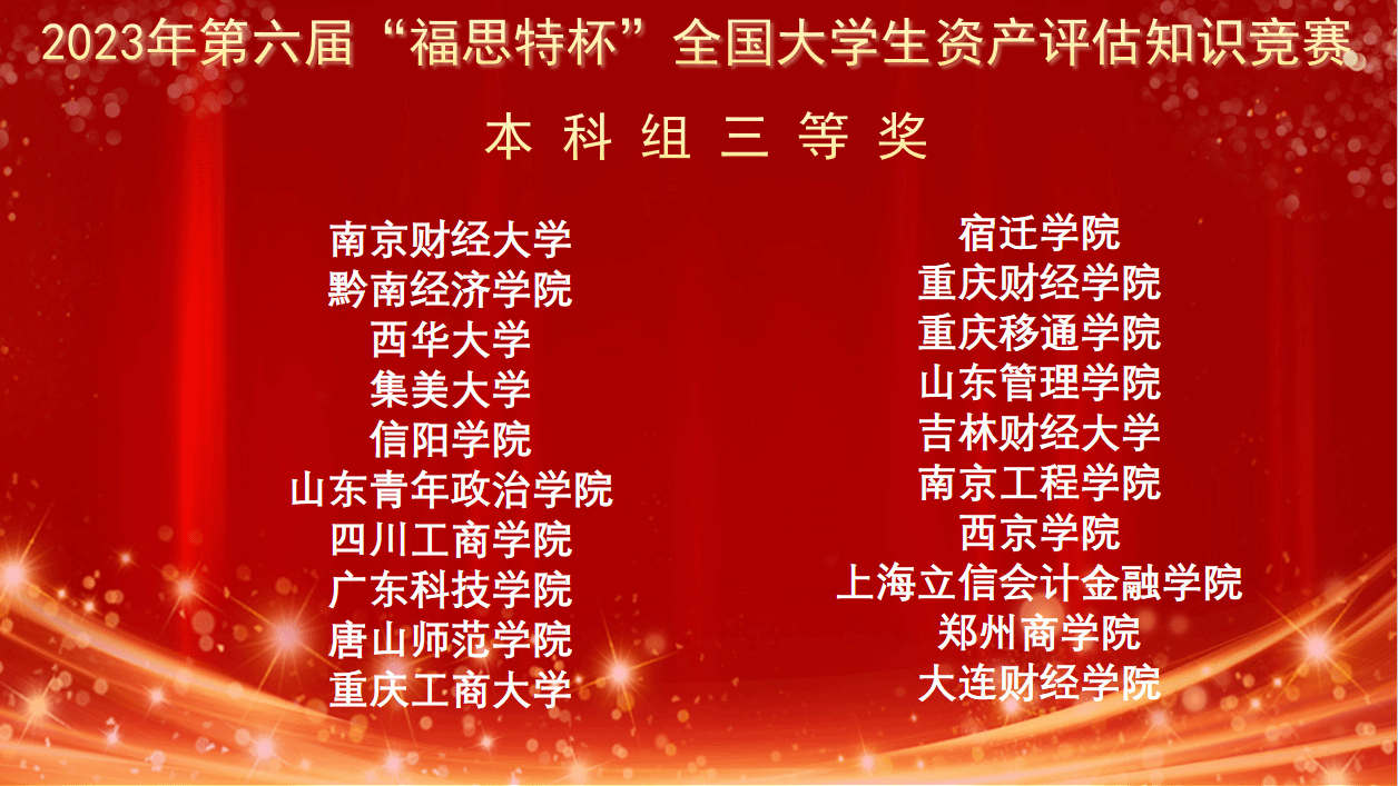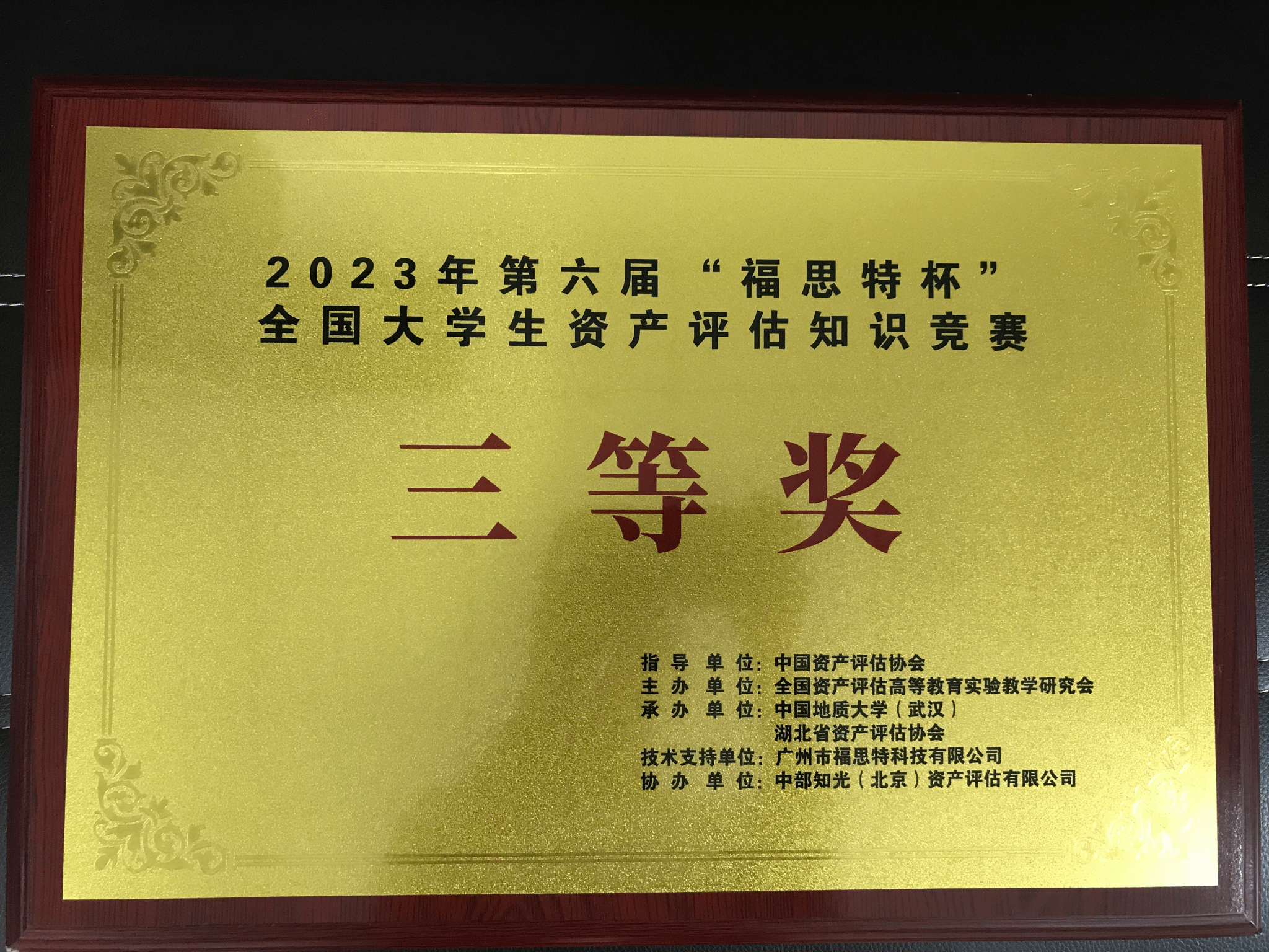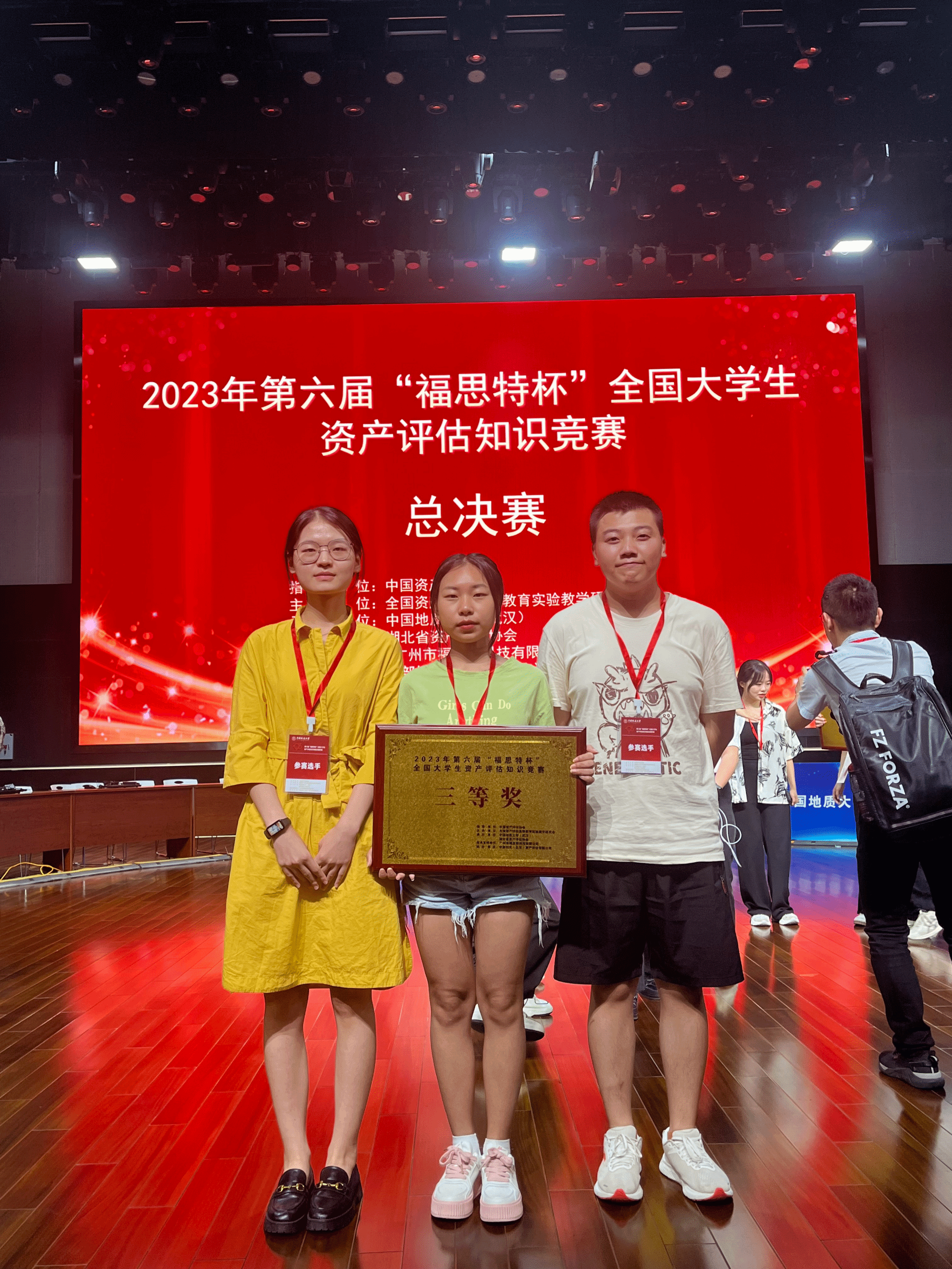 2023年9月9日,自疫情后首次举办的线下第六届“福思特杯”全国大学生资产评估知识竞赛全国总决赛在中国地质大学(武汉)未来城校区完美落幕。我校学子黄倩、谢津、王邦韬三位同学在李红艳、冉叶虹两位指导老师的带领下,有幸在激烈的决赛现场比拼中荣获三等奖,为我校资产评估专业在学科竞赛取得了新的突破。