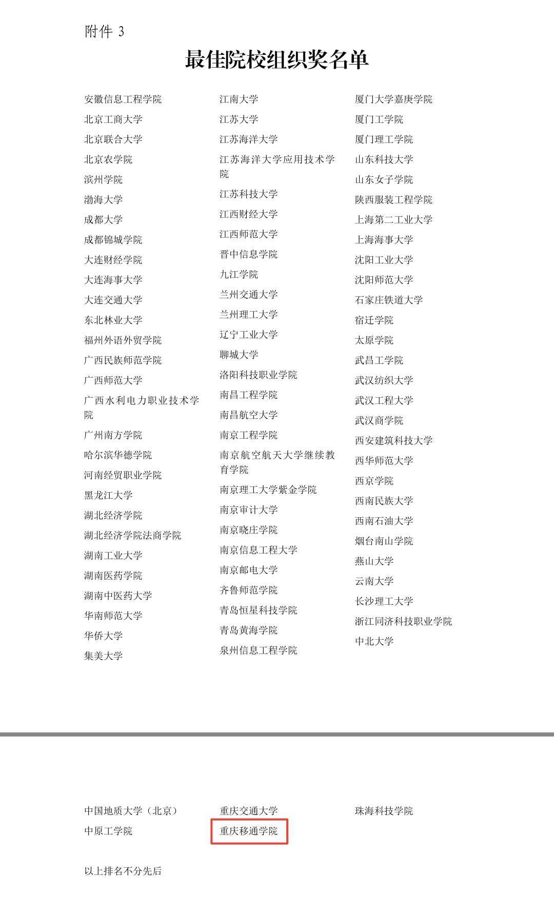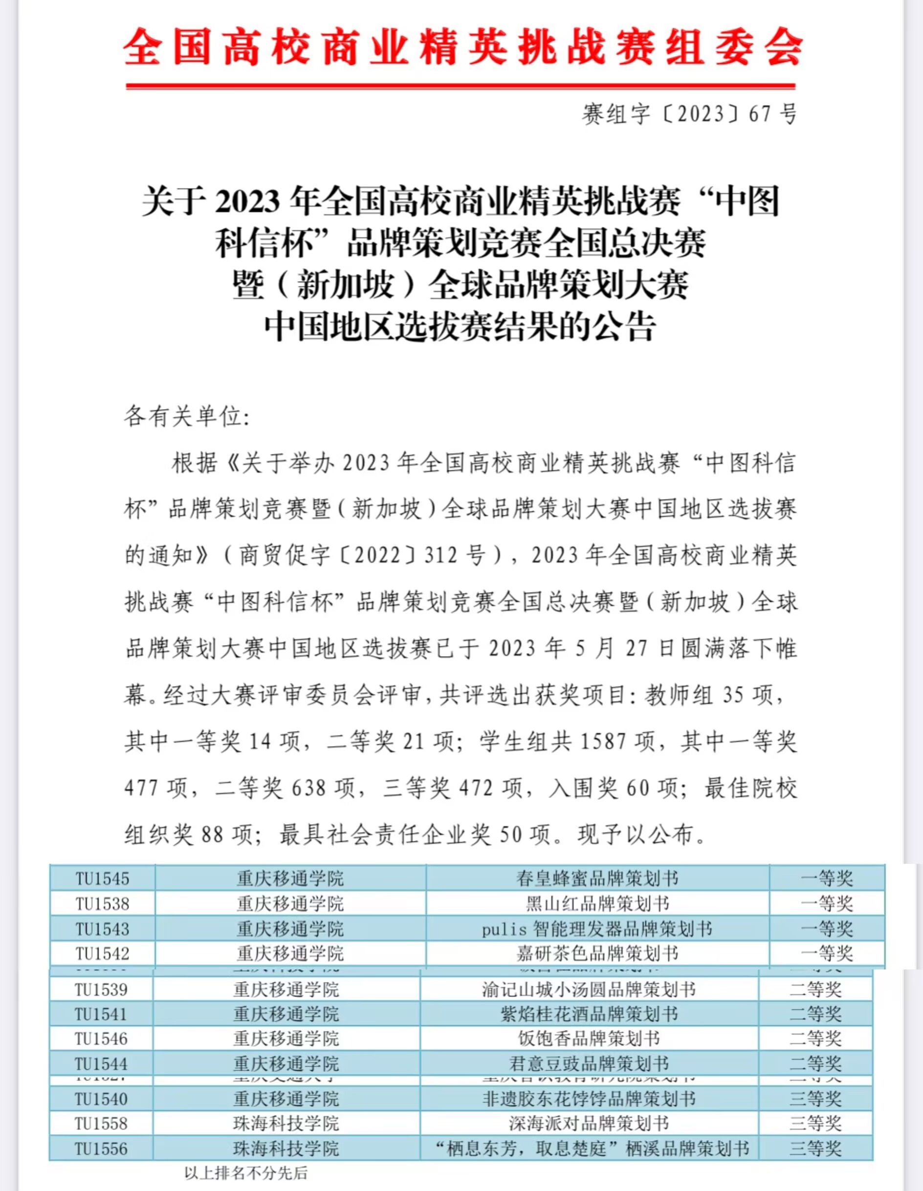 5月27日,2023年全国高校商业精英挑战赛“中图科信杯”品牌策划竞赛全国总决赛暨(新加坡)全球品牌策划大赛中国地区选拔赛圆满落幕。全国总决赛采用线上分组直播答辩的方式进行,我校九支参赛队伍与来自武汉大学、四川大学、云南大学等506所高校、1558支队伍同台竞技、激烈比拼,最终斩获一等奖4个、二等奖4个、三等奖1个,学校再度荣获“最佳院校组织奖”,国家级赛事获奖数量再创新高。
