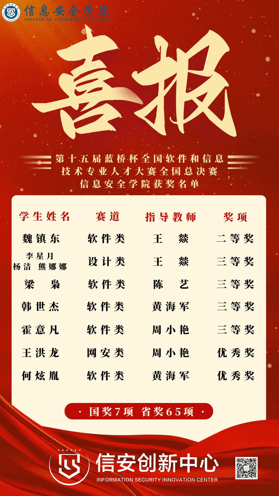 6月1日,备受瞩目的第十五届“蓝桥杯”全国软件和信息技术专业人才大赛全国总决赛圆满落幕。在此次大赛中,信息安全学院委派信安创新中心的指导老师王燚和黄海军,带领入围国赛的信安学子们前往重庆邮电大学赛点参赛。本次国赛取得了令人瞩目的成绩,共荣获软件类、设计类、网安类多赛道上的7项国家级奖项,其中二等奖1项、三等奖4项、优秀奖2项。