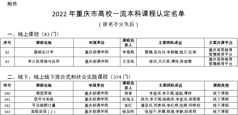 日前,重庆市教育委员会公布了2022年重庆市高校一流本科课程名单,我校共6门课程入选,其中《基础会计学》《单片机原理与应用》2门课程获认定为线上一流课程,《通信原理》《信号与系统》《平法钢筋计量》《高级英语(2)》4门课程获认定为线下一流课程。