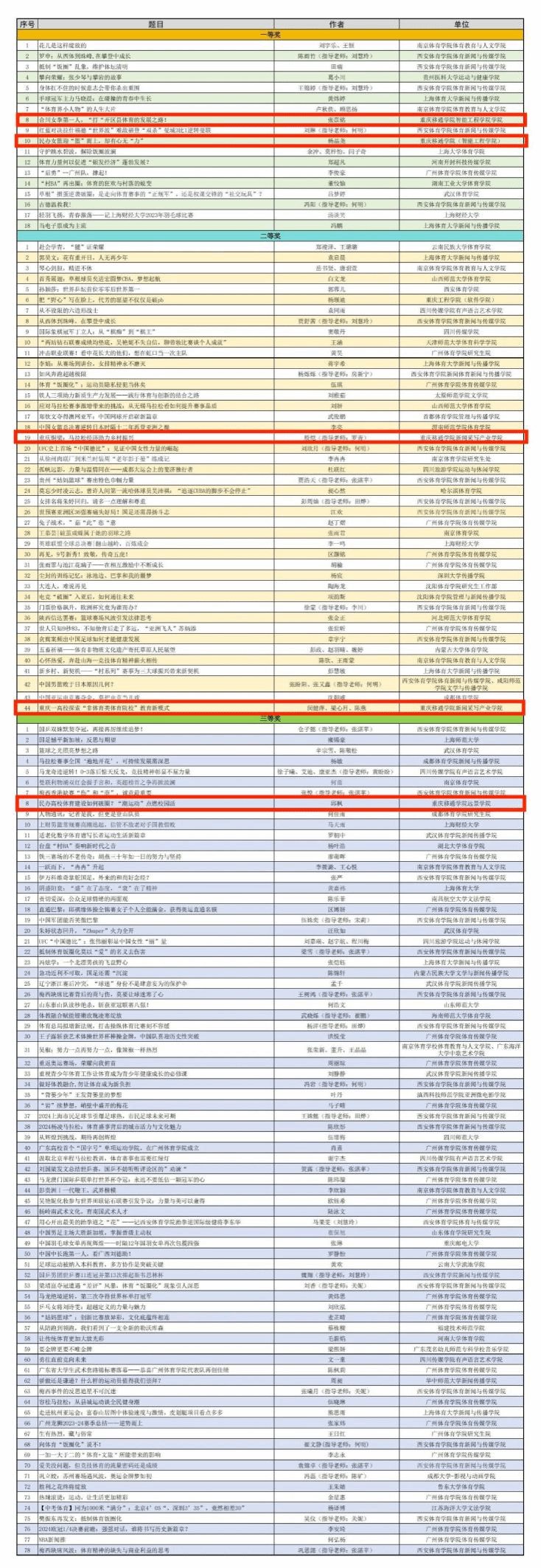 9月4日下午,第三届全国大学生体育新闻写作大赛获奖名单公示,重庆移通学院新闻采写产业学院张苡铭、杨晶尧、殷恺等7名学子凭借出色的新闻评论与深度报道作品,在全国多所高校参赛者中脱颖而出,一举揽获五个奖项,包括2个一等奖,2个二等奖,1个三等奖,标志着重庆移通学院在该项赛事中首次取得了重要突破。