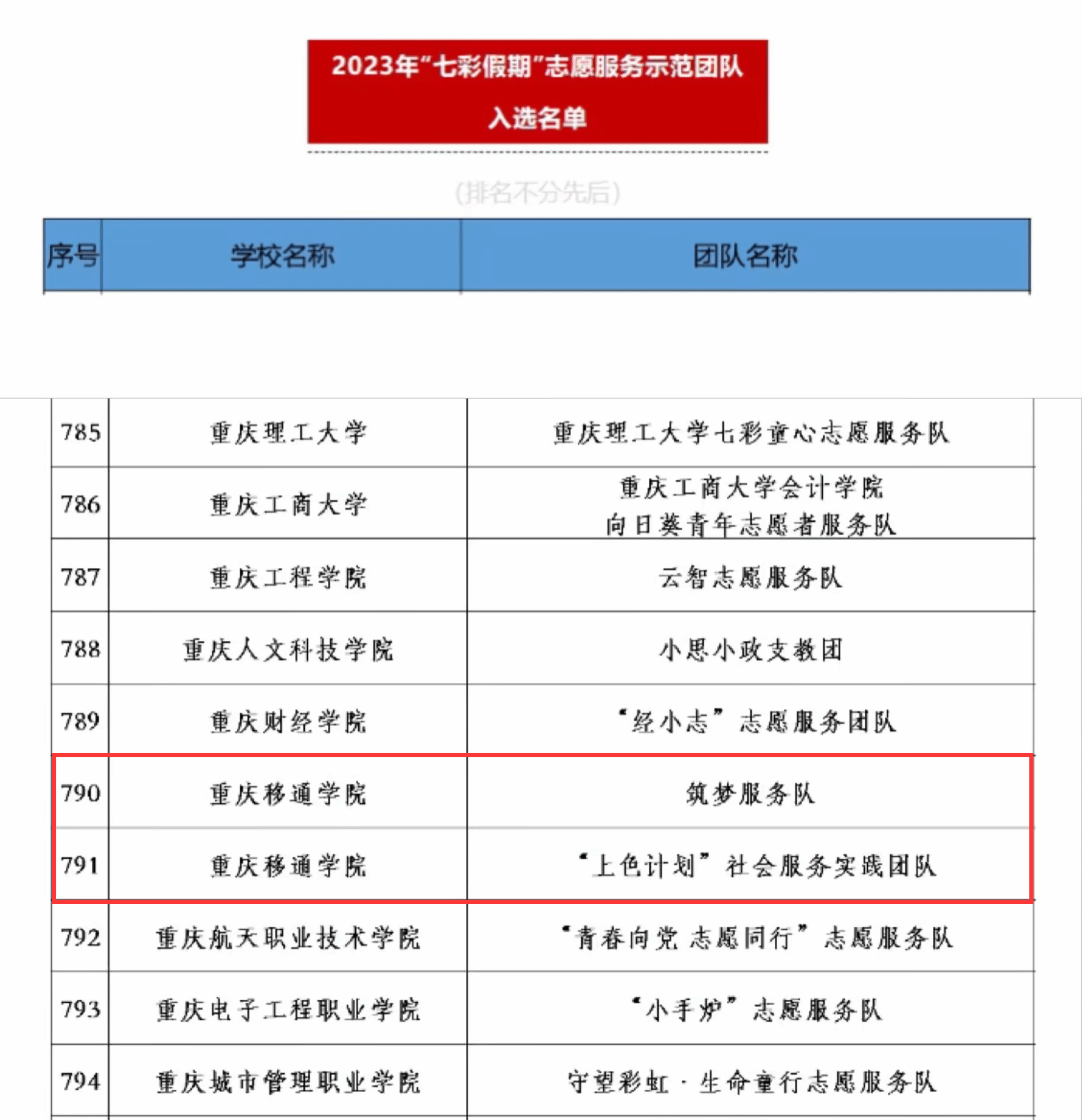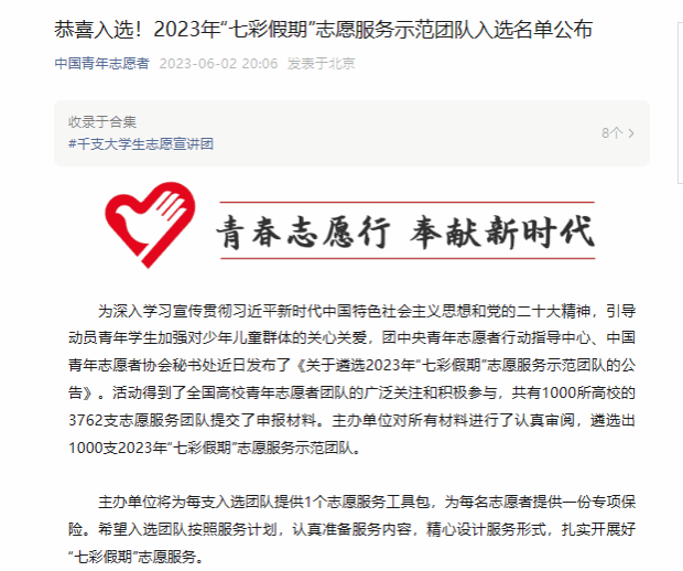 6月2日,2023年全国“七彩假期”志愿服务示范团队入选名单公布,通过自主申报、层层选拔、专业评选等环节,我校“筑梦服务队”“‘上色计划’社会服务实践团队”在全国3762多支志愿服务队伍中脱颖而出,其中,“筑梦服务队”已是第5次入选“七彩假期”全国示范团队。