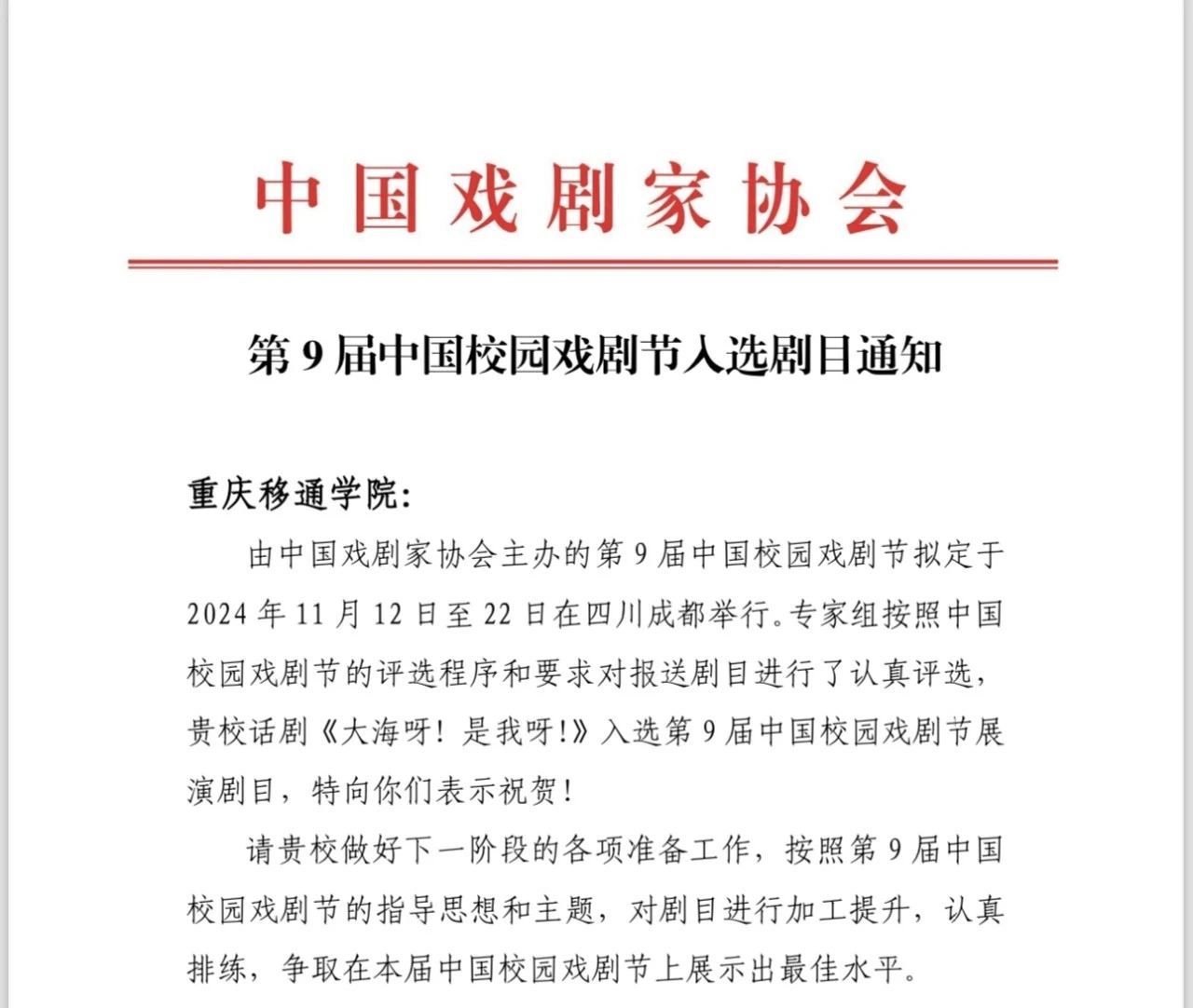 中国校园戏剧节是国家级校园戏剧活动,由中国戏剧家协会创办于2008年,每两年举办一次,该戏剧节是新中国成立以来举办的首个国家级校园戏剧节。2024年中国校园戏剧节在全国29个省市征集355部大小剧目(大戏143部)最终入选大戏18部,我校原创话剧《大海呀!是我呀!》成功入选!