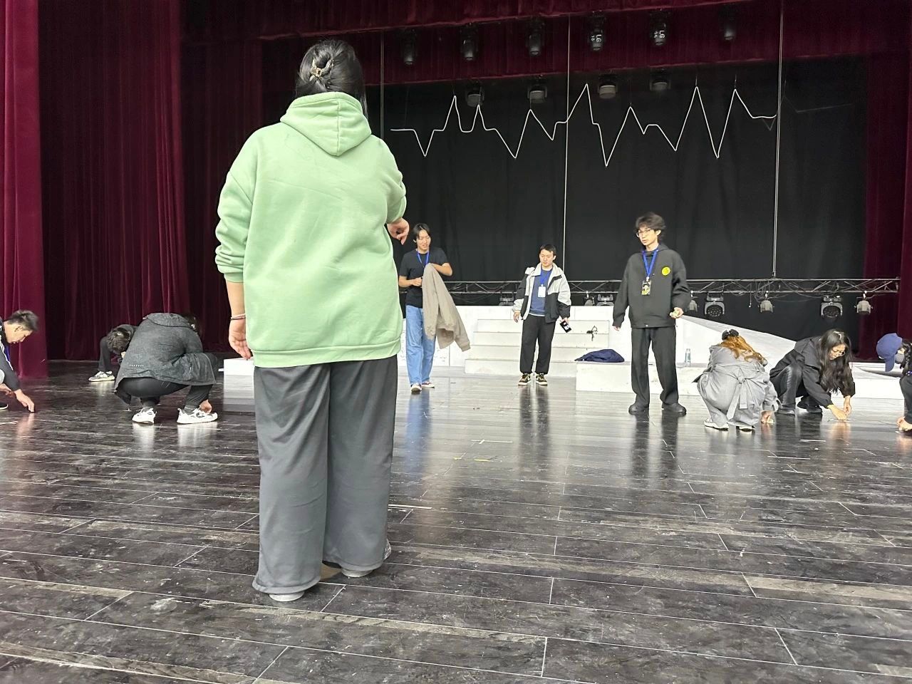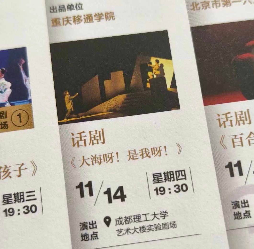 确定入选后,剧目表演团队展开了系统的复排工作,从剧本结构的调整,到舞美的重新制作。2024年11月11日结束了大凉山的四场演出后,11月12日大海剧目成员共30余人,分别从西昌和合川出发,抵达成都,从灯光的调试、道具的入场布景等,为11月14日的展演做足准备。