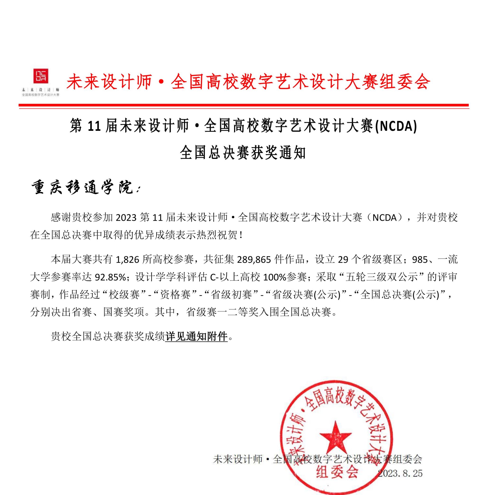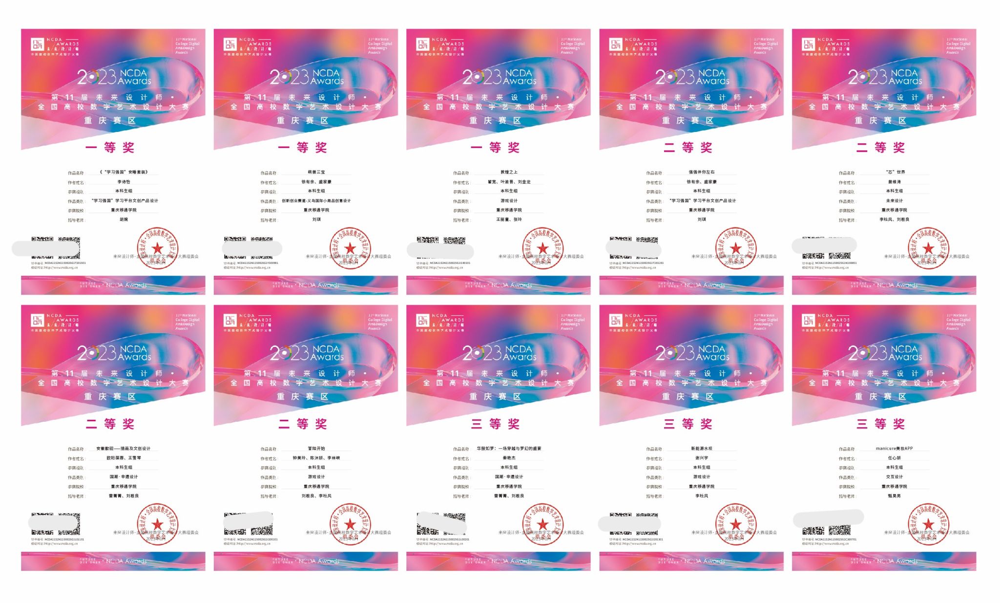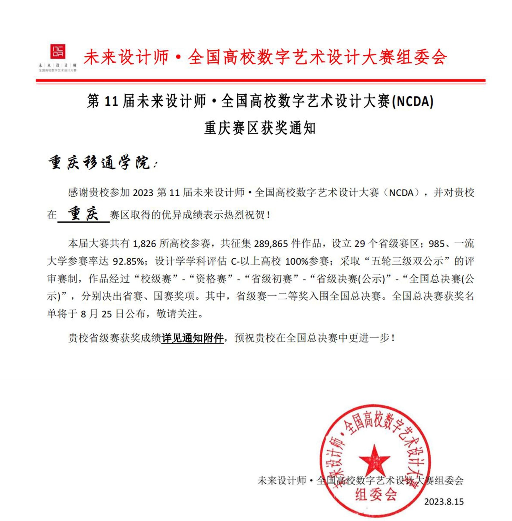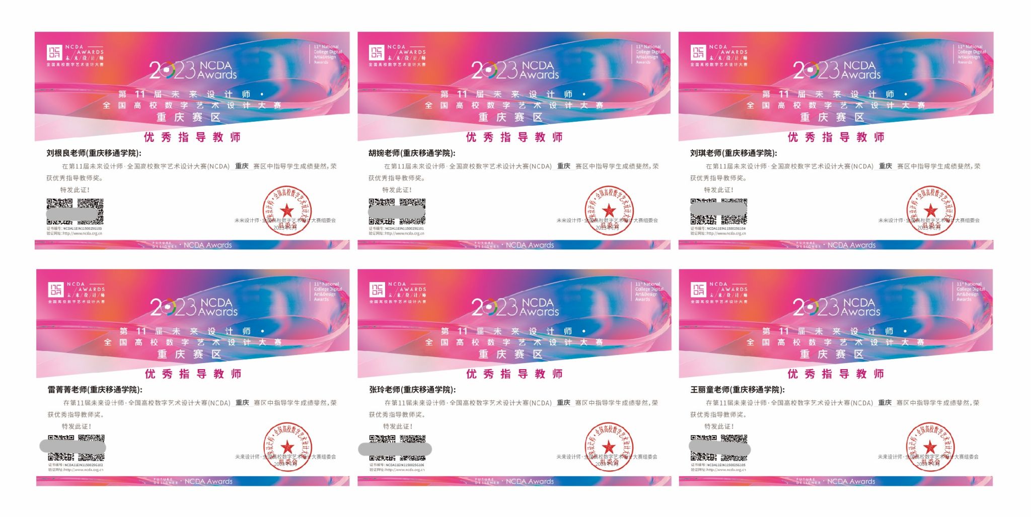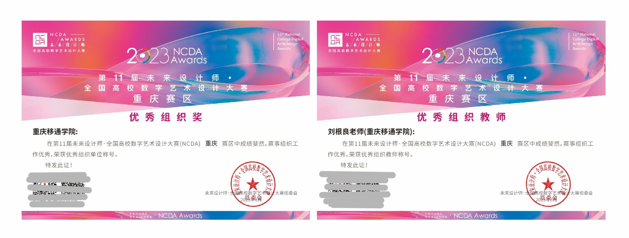 2023年,第十一届“未来设计师·全国高校数字艺术设计大赛(NCDA)”竞争空前激烈,1826所高校同台竞争。重庆移通学院艺术传媒学院在多个赛道中创领佳绩,共斩获国家等级奖3项、省部级等级奖32项。国家等级赛事中,教师王丽童、张玲所指导的学生团队获得“游戏设计赛道”一等奖;教师刘琪所指导的学生团队获得“创新创业赛道”一等奖;教师胡婉指导的学生获得“创新创业赛道”二等奖。省部级赛事中,由教师刘根良、雷菁菁、李杜风、甄昊男、胡婉、刘琪、张玲和王丽童指导的多个学生和学生团队分别获得一等奖6项、二等奖10项和三等奖16项,实现了移通学子在该赛事中的全新突破。
