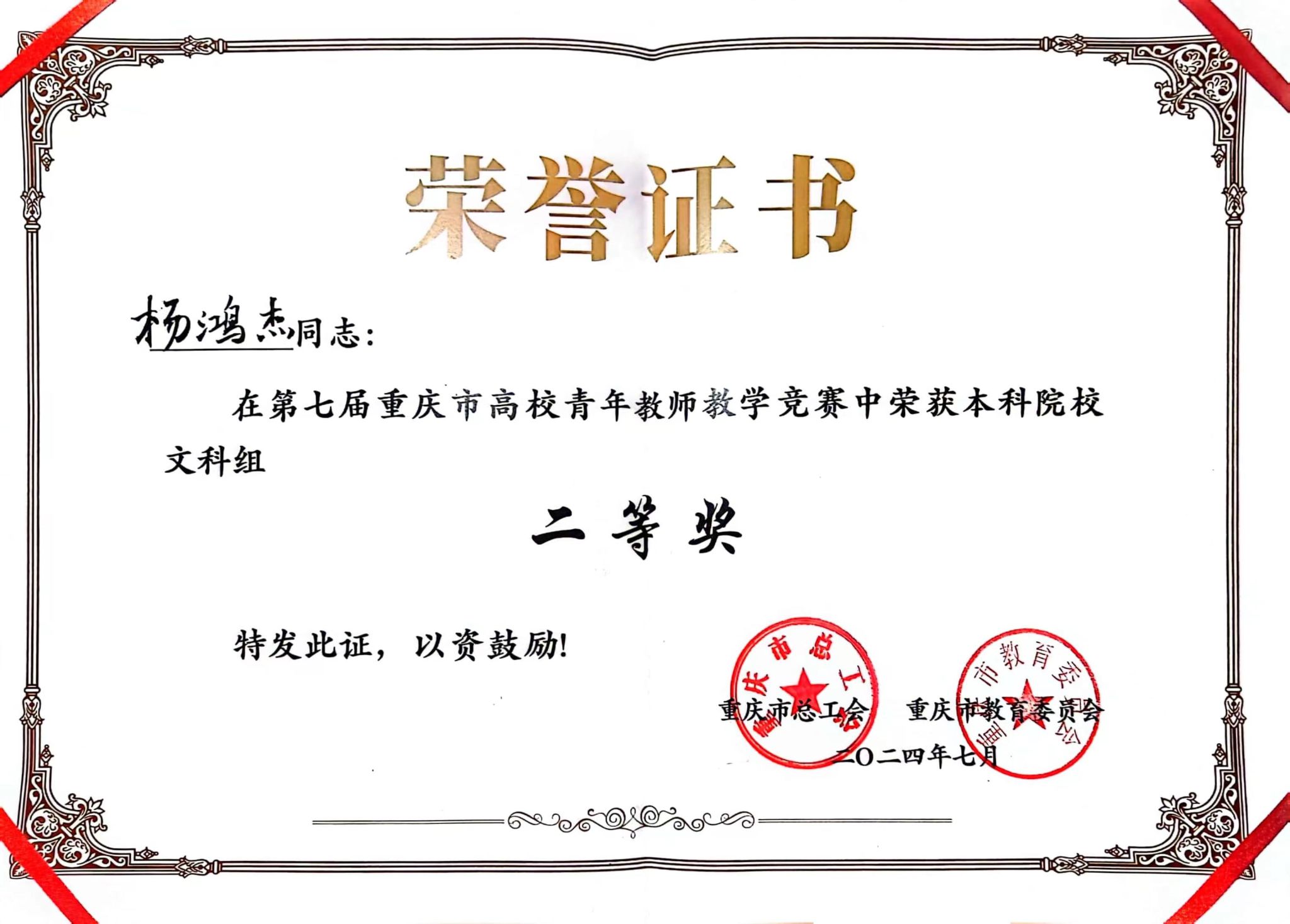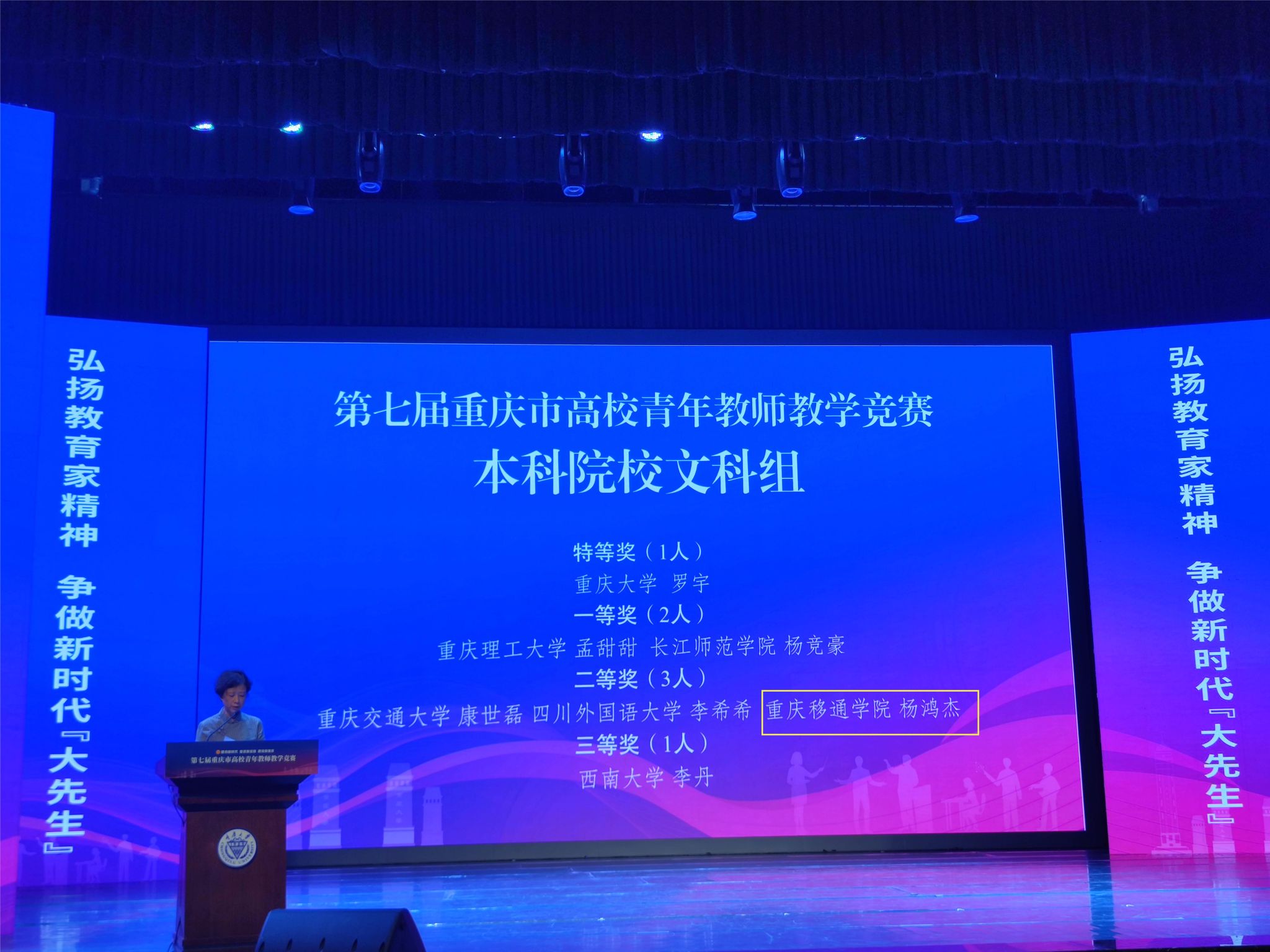 2024年7月2日至4日,第七届重庆市青年教师教学竞赛决赛在重庆大学虎溪校区举行,是重庆高校系统参与面广、学科门类多、组织规模大的一项全市性教学基本功赛事,由重庆市总工会、重庆市教育委员会主办,重庆市教科文卫体工会委员会、重庆大学承办,参赛队伍包括来自重庆大学、西南大学、重庆交通大学和四川外国语大学等“双一流”高校和老牌本科院校在内的62个代表队、216名青年教师参与文科、理科、工科、思想政治课专项4个组别的激烈比拼。最终,经专业评委评审,我校淬炼商学院基础教研室教师杨鸿杰脱颖而出,以优异成绩获得文科组二等奖。