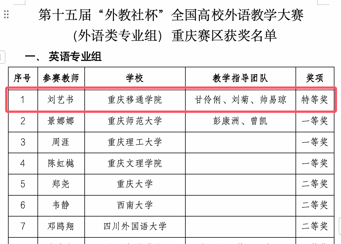 在中国高等院校外语教学第一品牌赛事——“外教社杯”全国高校外语教学大赛第十五届比赛(外语类专业组)重庆赛区复赛中,重庆移通学院创下历史!来自外语学院的三位移通教师选手在商务英语和英语专业两个组别中均以第一名的优异成绩荣获重庆市特等奖,在翻译专业组别中亦以优异成绩荣获重庆市一等奖,创下该项比赛移通选手历史最好成绩。两位特等奖获奖教师将于12月5、6日代表重庆市出征全国总决赛。