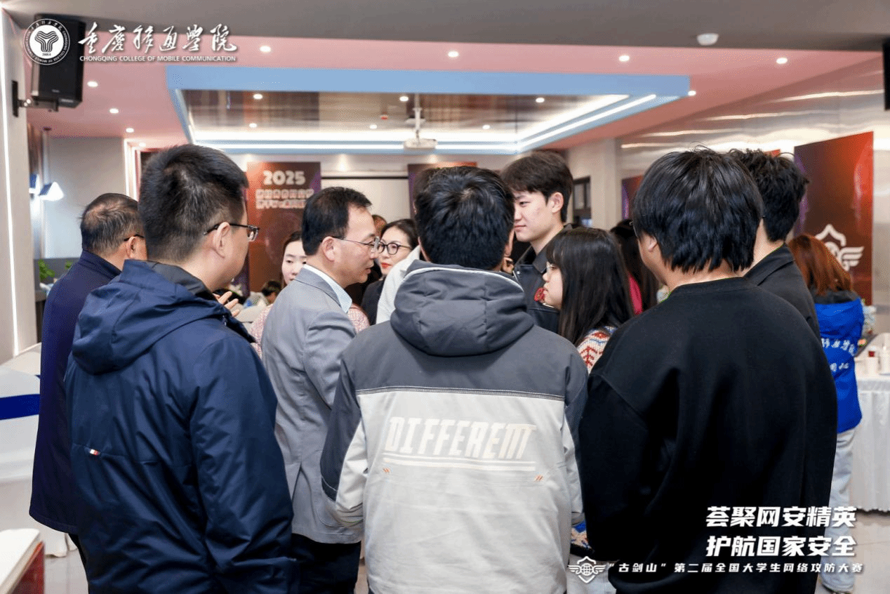 比赛结束后,指导老师及战队成员受邀参加交流酒会,来自全国各地的参赛师生、嘉宾以及各位领导齐聚一堂,共同分享网络安全领域的实践经验、前沿见解,探讨行业发展新趋势。重庆移通学院校长吕翊指出,本次大赛是积极响应国家战略号召、聚焦网络安全领域的重要举措,旨在为国家培养网络安全专业人才贡献力量。大赛精心搭建起优质平台,助力同学们提升网络安全技能,深度探索专业知识。吕翊校长表示,希望通过此次竞赛,进一步促进学校与企业间的深度合作,推动学术资源的广泛交流,真正的做到以赛促学,共同为网络安全事业的发展注入新的活力与动力。此次“綦剑网盾”战队的成功,正是学校特色办学体系下赛教融合成果的生动体现。