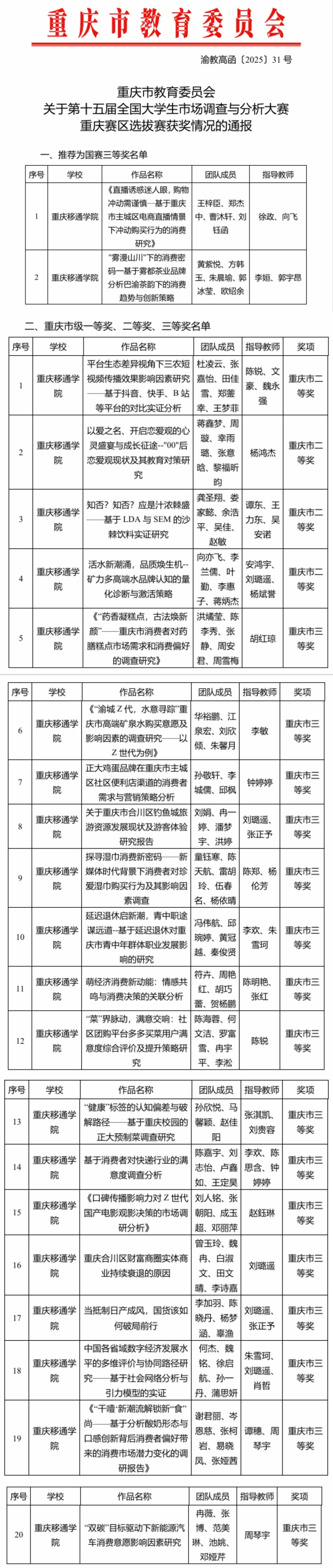 我校各团队通过不懈努力,最终在第十五届“正大杯”全国大学生市场调查与分析大赛重庆赛区中获得22个奖项:其中,重庆市一等奖2个(同时推荐为国家三等奖),重庆市二等奖4个,重庆市三等奖16个。