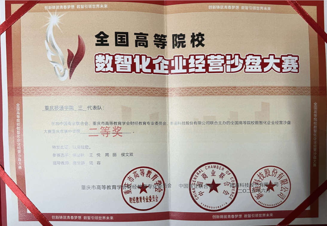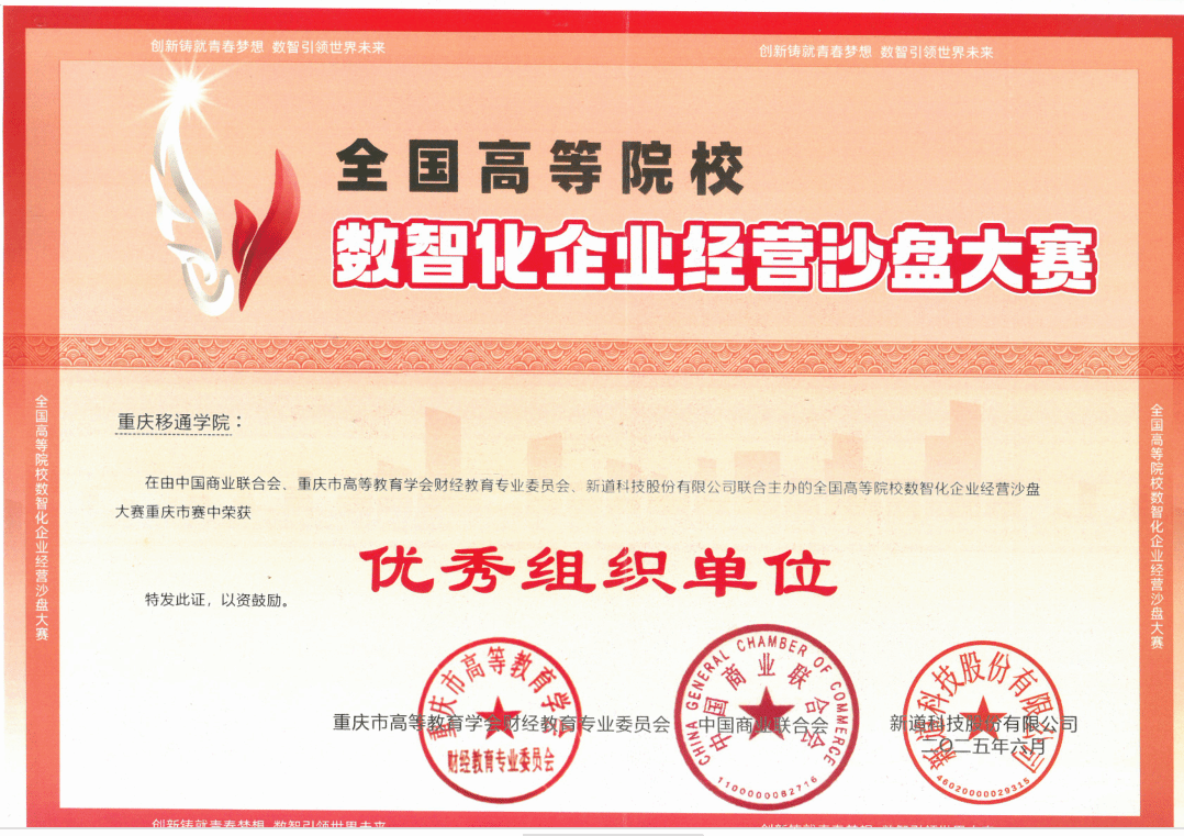 6月21日,2025年全国高等院校数智化企业经营沙盘大赛重庆市赛在重庆邮电大学落下帷幕。大赛由重庆市高等教育学会财经教育专业委员会、中国商业联合会、新道科技股份有限公司主办,旨在推动管理与财经类专业的实践教学改革,提高人才培养质量。经过激烈比拼,重庆移通学院多支参赛队伍凭借出色表现斩获多项荣誉,其中,一支队伍获二等奖、两支队伍获优胜奖,学校还荣获“优秀组织单位”,尽显教学实践与竞赛育人成果。