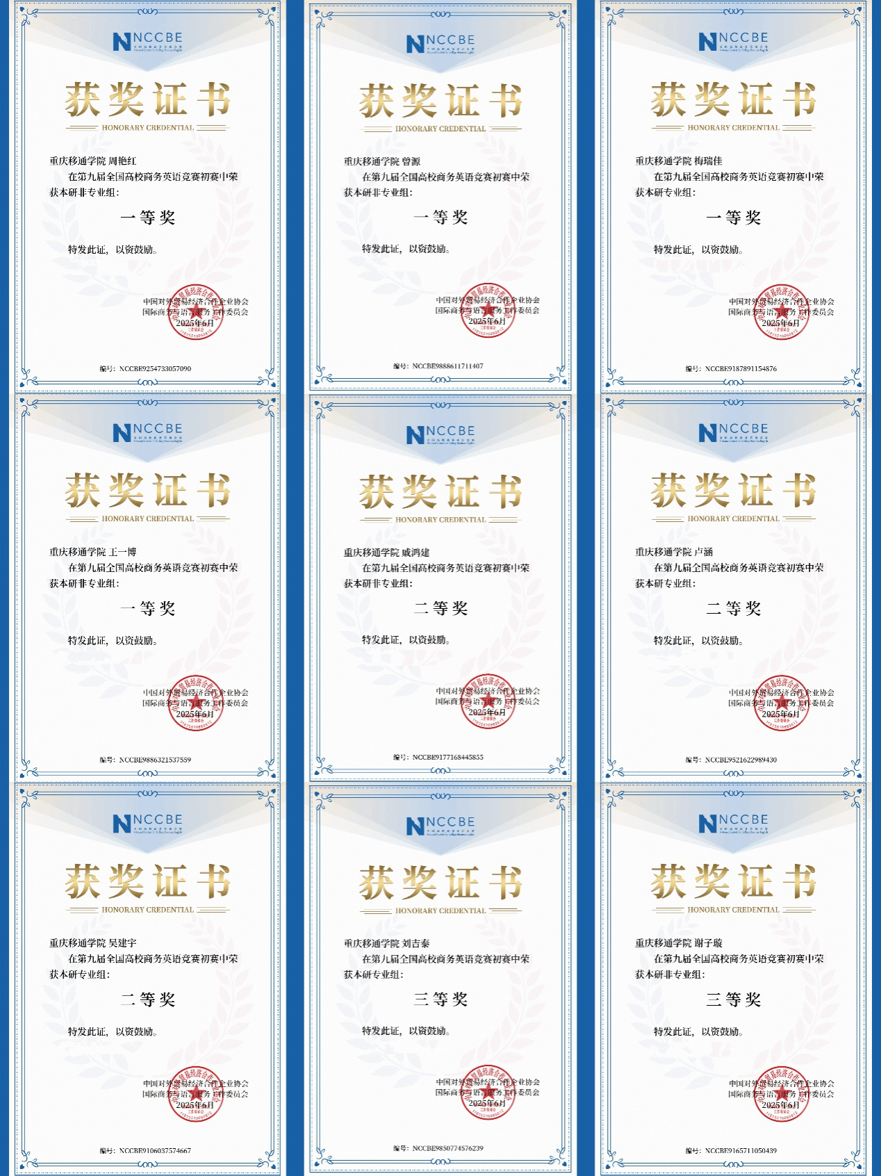 近日,由中国对外贸易经济合作企业协会国际商务与语言服务工作委员会主办的第九届全国高校商务英语竞赛全国总决赛落下帷幕。全国高校商务英语竞赛是我校在新时代背景下贯彻落实《高等院校外国语言文学类专业教学质量国家标准》的C类学科竞赛之一,由重庆移通学院国际商学院承办,大赛分为初赛和全国决赛。本次大赛也吸引了来自北京大学、厦门大学、广东外语外贸大学、大连外国语大学、四川外国语大学、中南财经政法大学等700余所院校的参与。