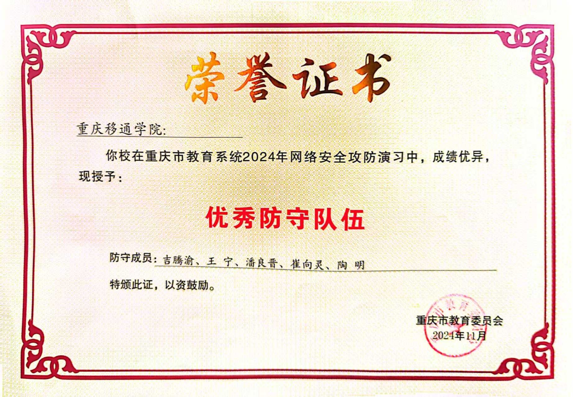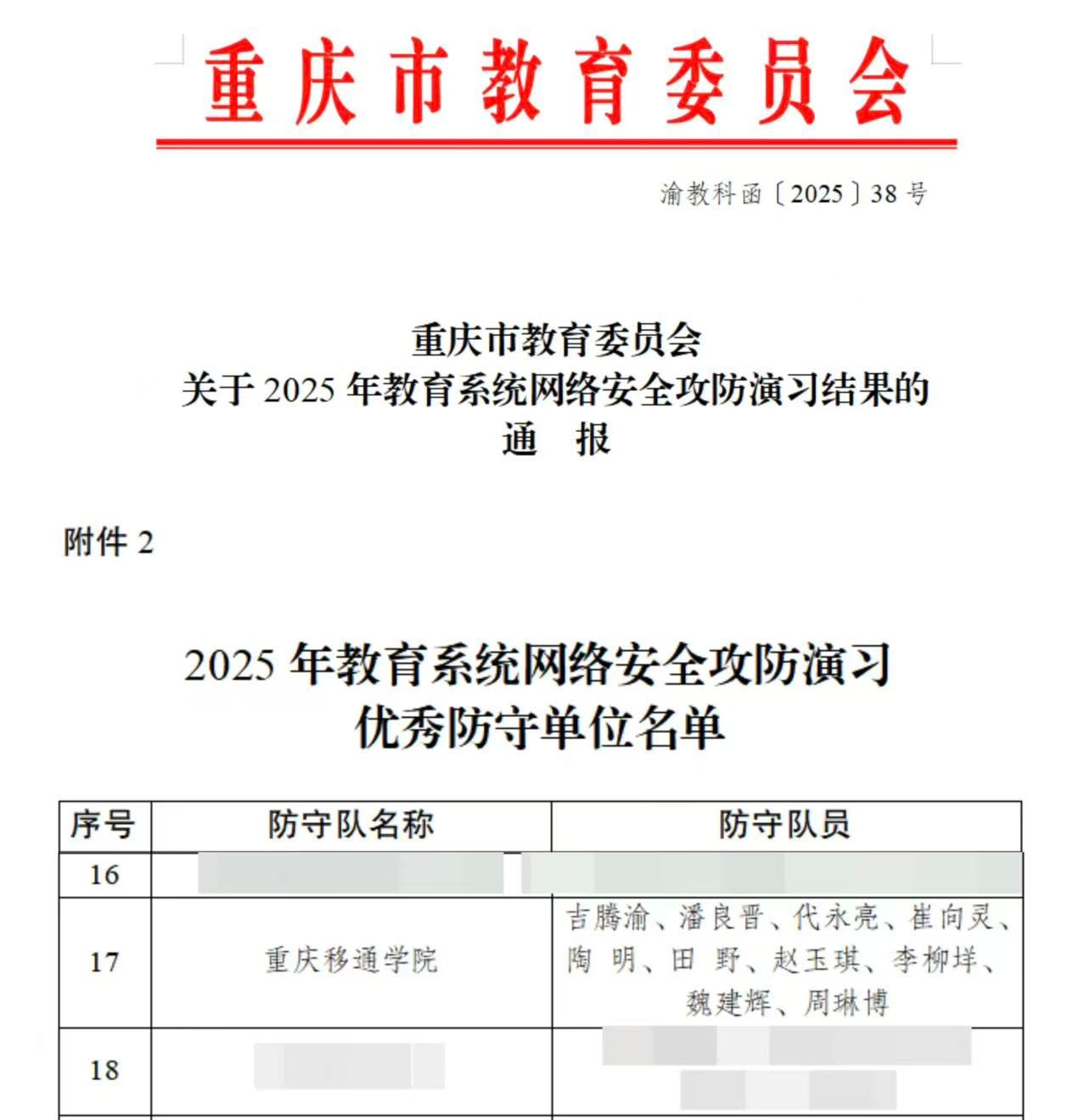 近日,重庆市教育委员会发布《关于 2025 年教育系统网络安全攻防演习结果的通报》(渝教科函〔2025〕38号),重庆移通学院凭借扎实的防御体系、高效的应急处置能力,在全市 107 支防守队伍中脱颖而出,再度获评“优秀防守单位”,实现该荣誉蝉联。