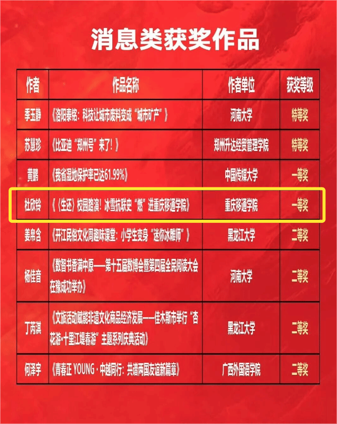 11月30日晚,第十四届铁塔记者文化节全国大学生新闻采写大赛获奖作品名单公示。重庆移通学院新闻采写产业学院(合川校区)学员杜欣玲、史秋月、代儀从全国多所高校参赛者中脱颖而出,分获消息类一等奖与非虚构类二等奖。