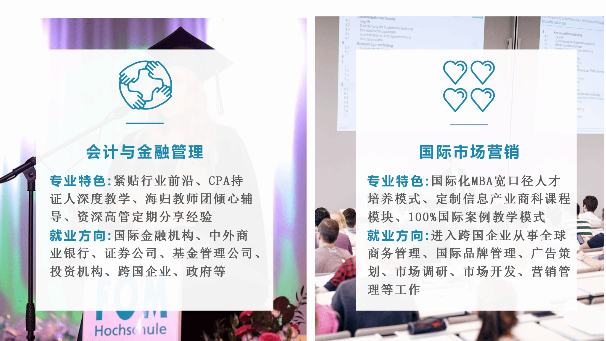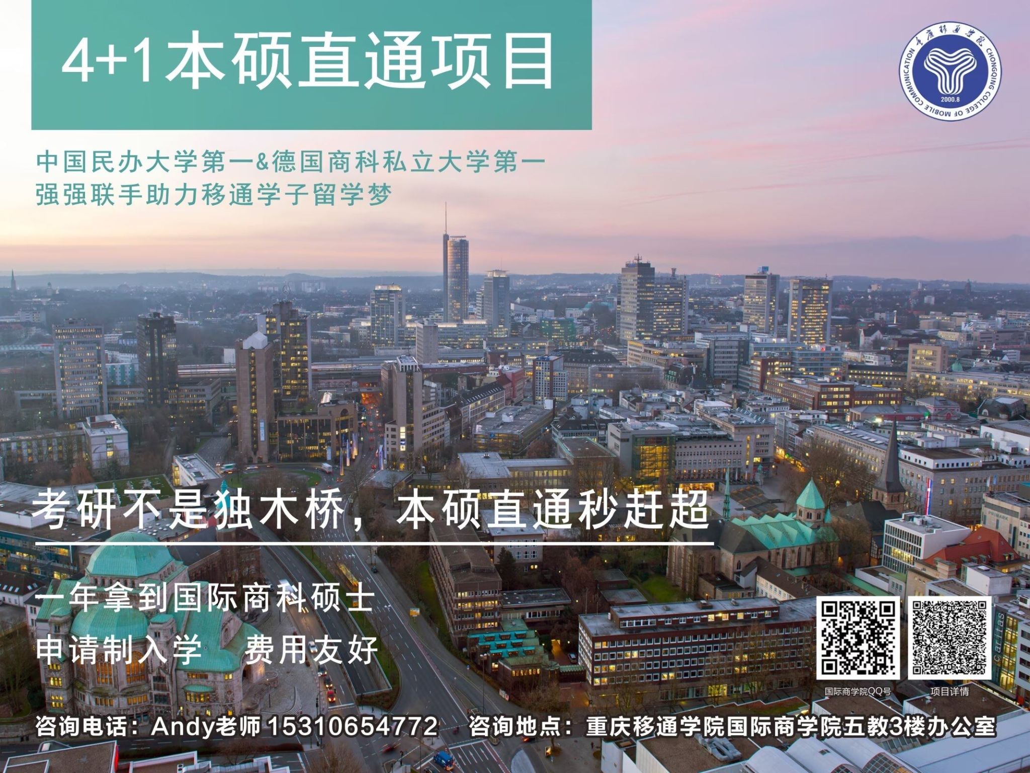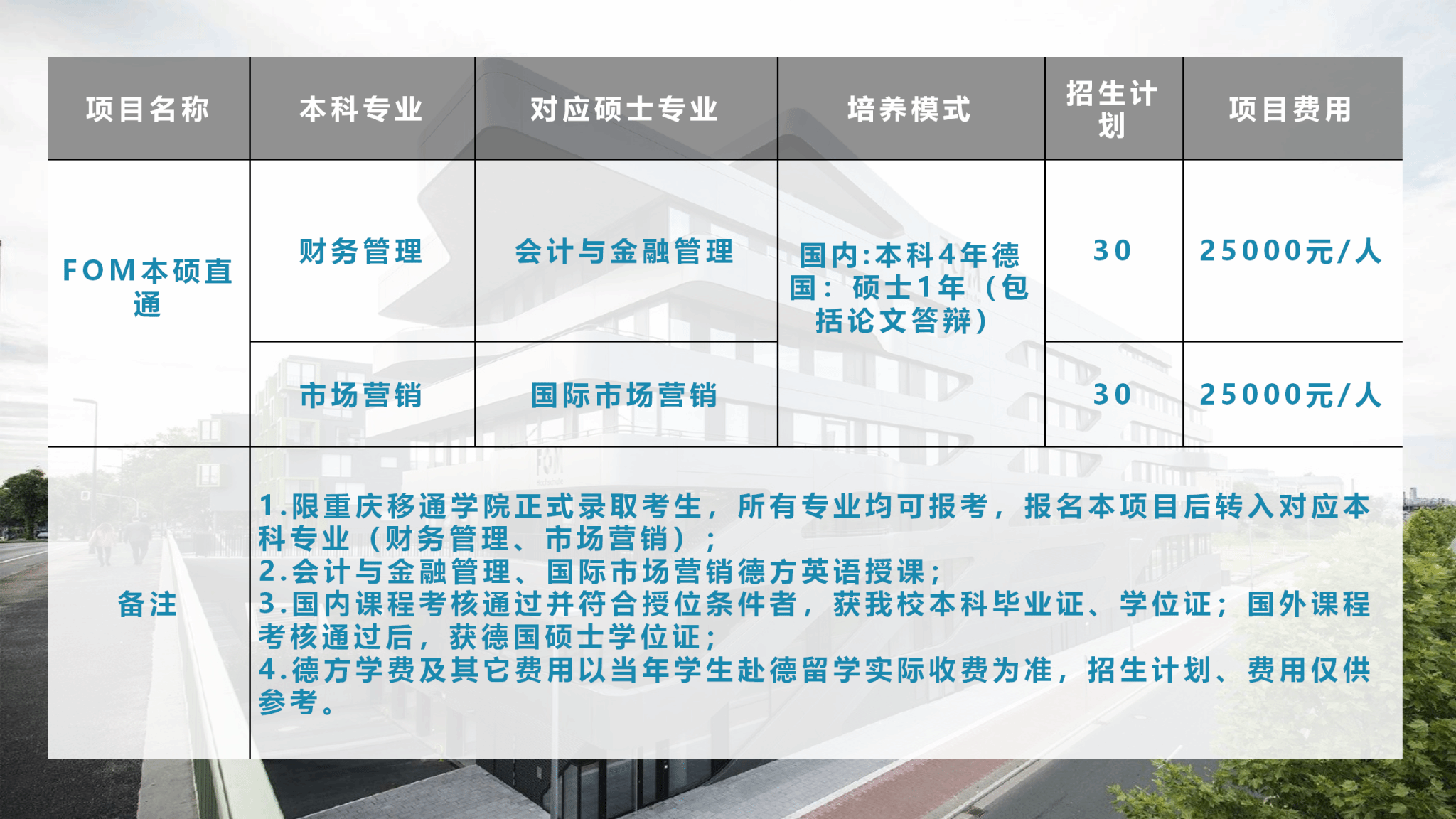 FOM4+1本硕直通项目介绍:本项目为德中联合培养的4+1本硕直通硕士项目。其中,本科4年及国内管理强化类课程由重庆移通学院国际商学院负责,德方埃森经济管理应用技术大学负责1年的国外硕士培养,学生毕业后可获得全球通用、中国教育部认可的文科硕士学位(Master of Arts)。