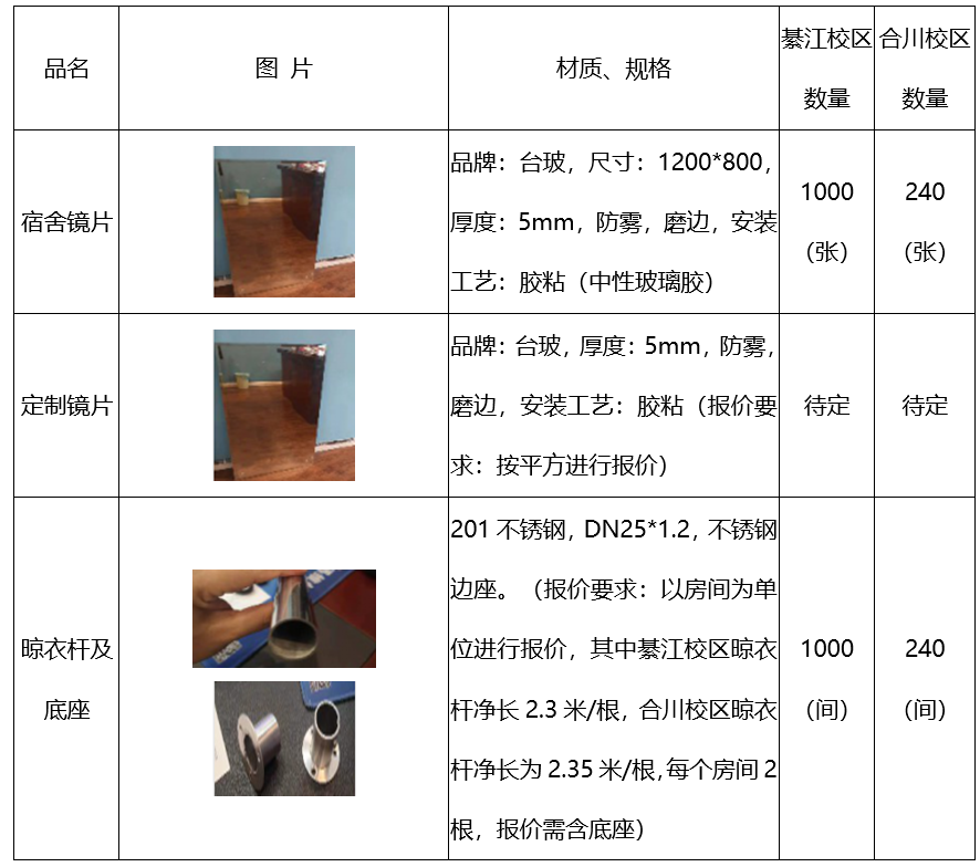 重庆移通学院建设需要,拟采购晾衣杆、镜片、置物架、毛巾挂钩一批,诚邀有实力、有信誉、供货能力强和售后服务好的商家进行报价。