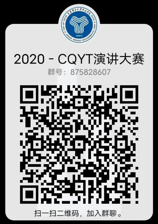扫描二维码(见附件1,QQ群号:875828607)加入“2020-CQYT演讲大赛”群,并填写在线报名表格。