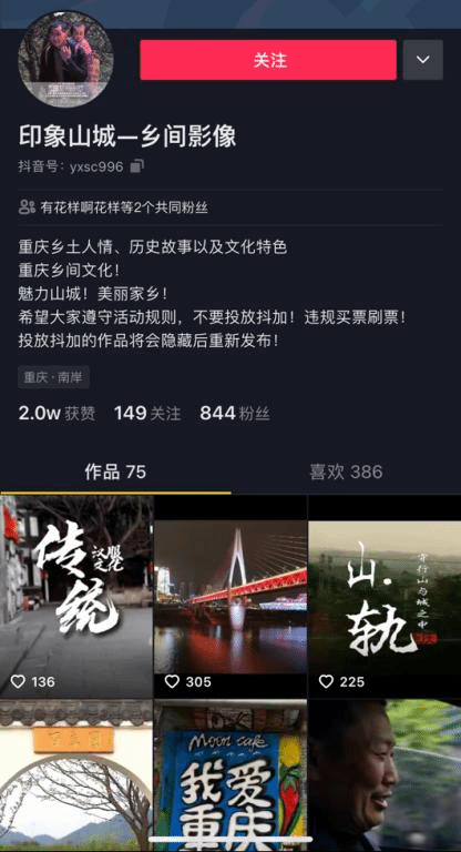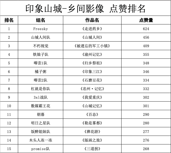 经统计,本次活动共收到75份作品,决赛入围作品由抖音点赞排名产生。截至4月15日,经抖音平台点赞投票评选出15份优秀作品,分别为:《走进药乡》、《山城人间》、《被遗忘的军工小镇》、《渝州记忆》、《归乡祭祖》、《印象三江》、《石墨豆花》、《忠州·记忆》、《我爱重庆》、《山城记忆》、《百态》、《勒是雾都》、《葬花游》、《版画之旅》、《三道拐》。