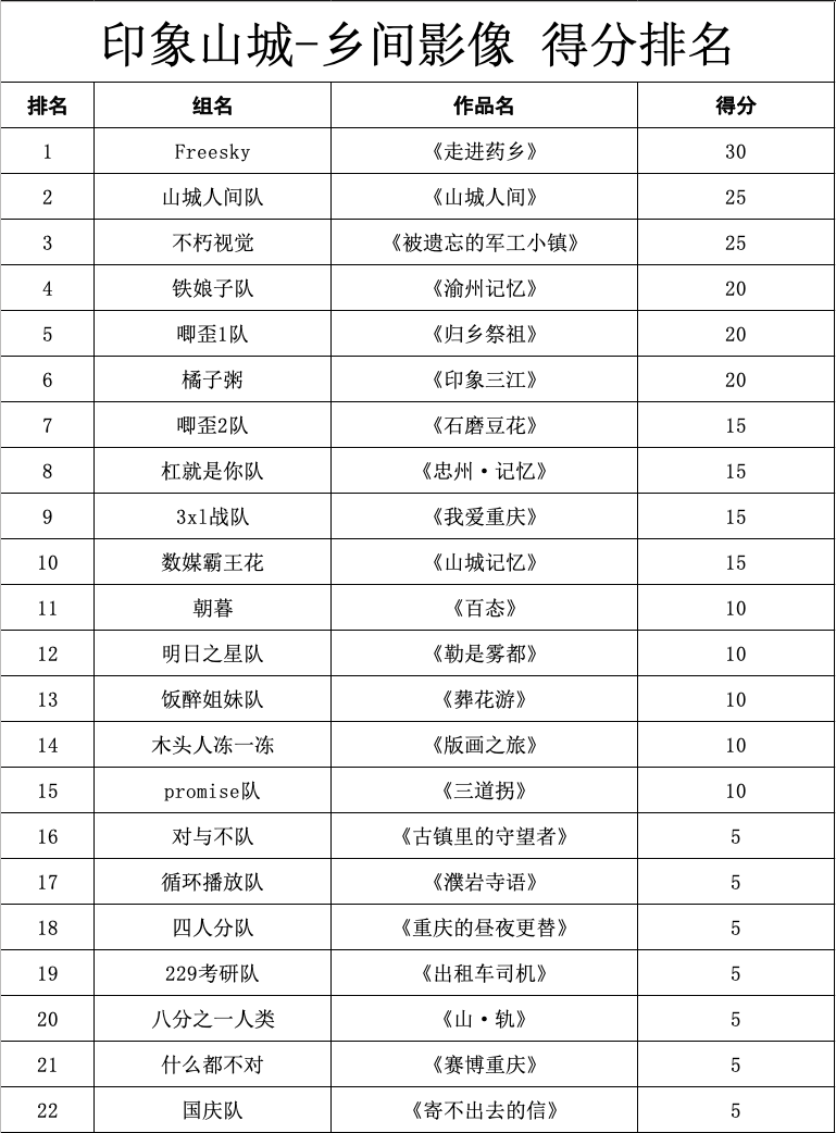除抖音平台播放前15名外,七位专业评审老师选取了7份优秀作品直接进入决赛,作品分别为《古镇里的守望者》、《濮岩寺语》、《重庆的昼夜更替》《出租车司机》、《山·轨》、《赛博重庆》、《寄不出去的信》。根据评分标准,初赛作品第1名得30分;第2、3名得25分;第4、6名可得20分;7、10名得15分;11、15名得10分,由专业评审老师选取的7支队伍各得5分,且初赛分数将按比例纳入最终成绩。