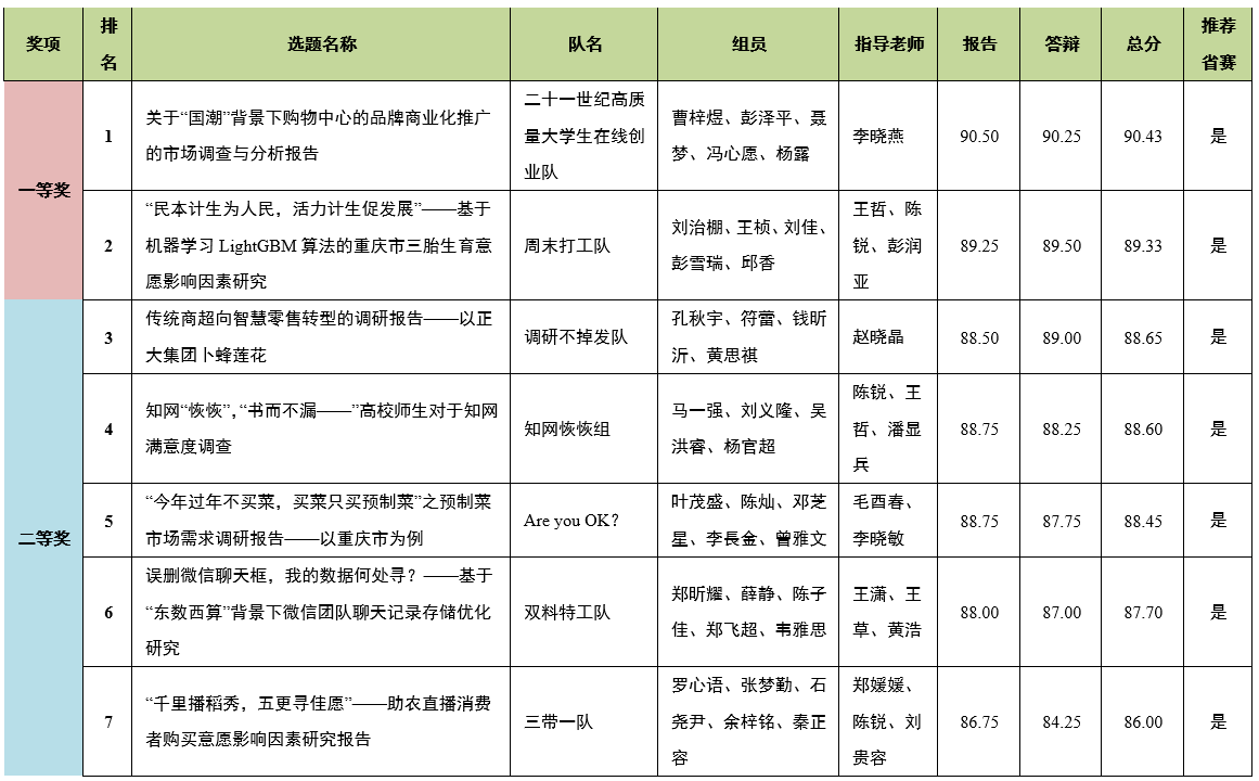 根据《关于举办“正大杯”第十二届全国大学生市场调查与分析大赛重庆移通学院决赛的通知》具体内容,我校经过调研报告评审、调研报告展示及答辩等环节,评选出校级一等奖2组,二等奖5组,三等奖14组,并决定推选排名前14的队伍参加省赛,现将具体获奖名单及相关事项通知如下: