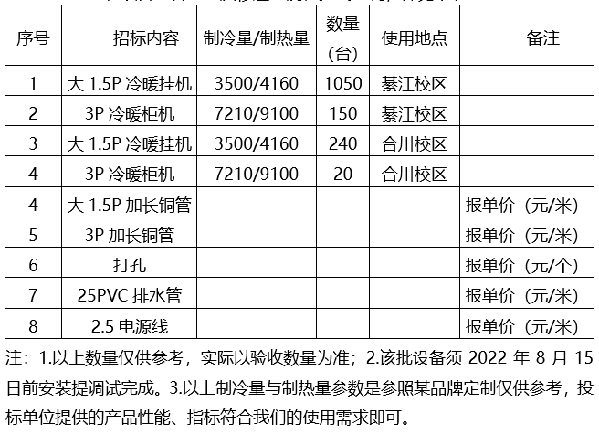 因重庆移通学院工程建设需要,合川校区、綦江校区拟采购柜挂式空调一批,诚邀有实力、有信誉、供货能力强和售后服务好的商家进行投标。重庆移通学院负责对该项目的资金担保、结算。
