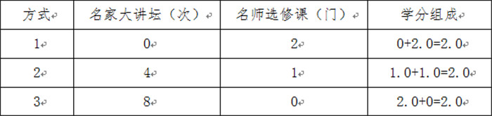 “名师选修课”每门课程由四个系列讲座组成,计1.0学分;“名家大讲坛”每一次讲座计0.25学分。“文化移通”学分具体组合方式如下。