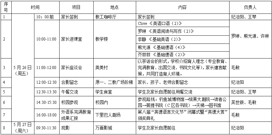 尊敬的家长朋友: 您好! 衷心感谢您对我校一直以来的信任和支持,学生的成长成才需要家校的合作才能更好的实现。为了让您更好、更直观地了解我校的办学条件、办学特色、人才培养优势以及孩子在学校的学习生活情况,共同促进孩子的成长,我校外国语言文学系决定于2017年5月26日—27日举行家长开放日活动,我们诚挚欢迎您的到来。届时您将游览风景如画的美丽校园,走进严谨治学的专业课堂,了解并与学校交流育人理念,感受外语学子丰富多彩的“完满生活”。