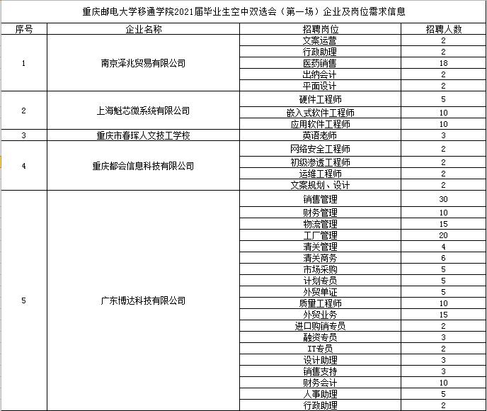 为了给2021届毕业生和用人单位搭建更便捷的交流平台,更好的促进我校2021届毕业生顺利就业,学校定于2020年12月22日10:00-17:00在智联招聘网举办重庆邮电大学移通学院2021届毕业生空中双选会(第一场),届时将邀请33家用人单位招聘英才,提供2160个岗位供学生选择。人才需求涵盖计算机、设计、新媒体、教育等多个行业。欢迎广大应届毕业生积极关注,踊跃参加。