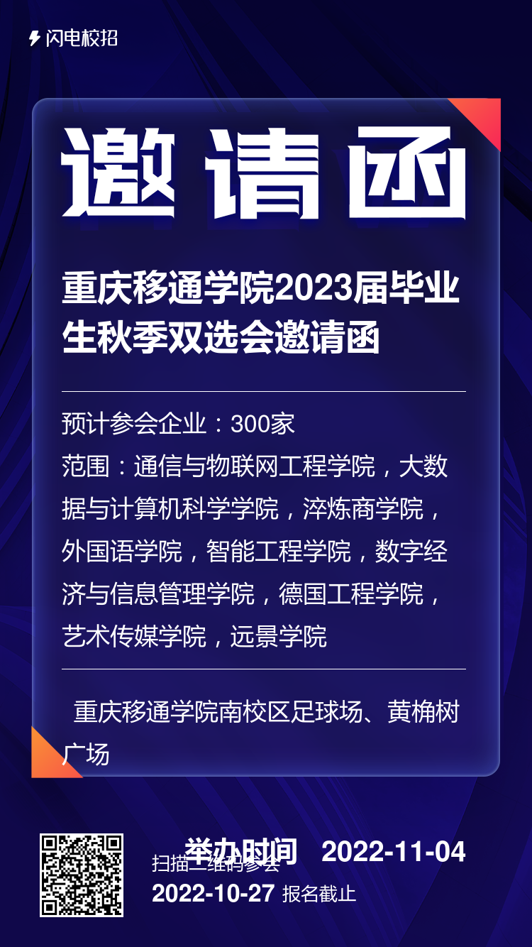 为进一步促进毕业生与用人单位“双选”就业,深化校企合作,我校暂定于2022年11月4日举办重重庆移通学院2023届毕业生秋季双选会。诚挚邀请贵单位前来我院招聘英才,洽谈合作。