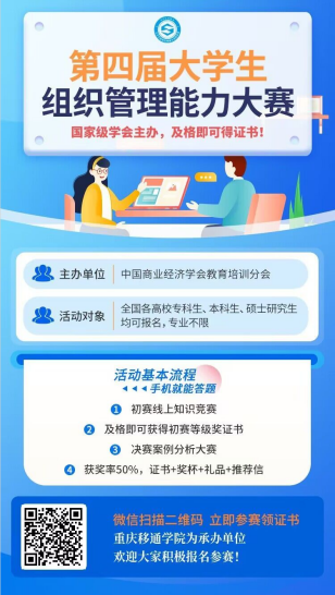 第四届大学生组织管理能力大赛由中国商业经济学会教育培训分会主办,聚焦以赛促学,进一步激发高等教育人才培养内涵式发展的动力和活力,旨在培养数字经济组织管理高素质人才,为我国商业经济高质量发展营建储备人才。结合我校“信息产业商学院”办学定位和“四位一体+双院制”的人才培养模式,现就开展2023年第四届大学生组织管理能力大赛报名通知。