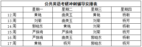 老师们纷纷表示,将尽全力为考研的同学们进行针对性的冲刺辅导。公共外语教研室将持续开展关于学生考研方向、题型、解题思路等专题辅导问题的研究和讨论。现已制定出公共英语考研冲刺辅导安排表。除安排表里的固定时间之外,学生还可以通过提前预约、网上答疑等方式与辅导老师进行一对一交流。
