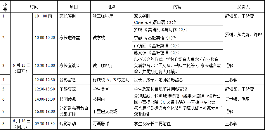 您好! 衷心感谢您对我校一直以来的信任和支持,学生的成长成才需要家校的合作才能更好的实现。为了让您更好、更直观地了解我校的办学条件、办学特色、人才培养优势以及孩子在学校的学习生活情况,共同促进孩子的成长,我校外国语言文学系决定于2018年6月15日—16日举行校园开放日活动,我们诚挚欢迎您的到来。届时您将游览风景如画的美丽校园,走进严谨治学的专业课堂,了解并与学校交流育人理念,感受外语学子丰富多彩的“完满生活”。