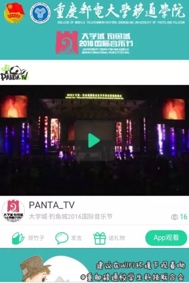 为保证校内外各群体更好的了解我校音乐节现场实况,我校在本次音乐节期间提供多渠道现场直播,请各位予以关注。熊猫通道登录Panda TV:www.panda.tv输入房间号:586213